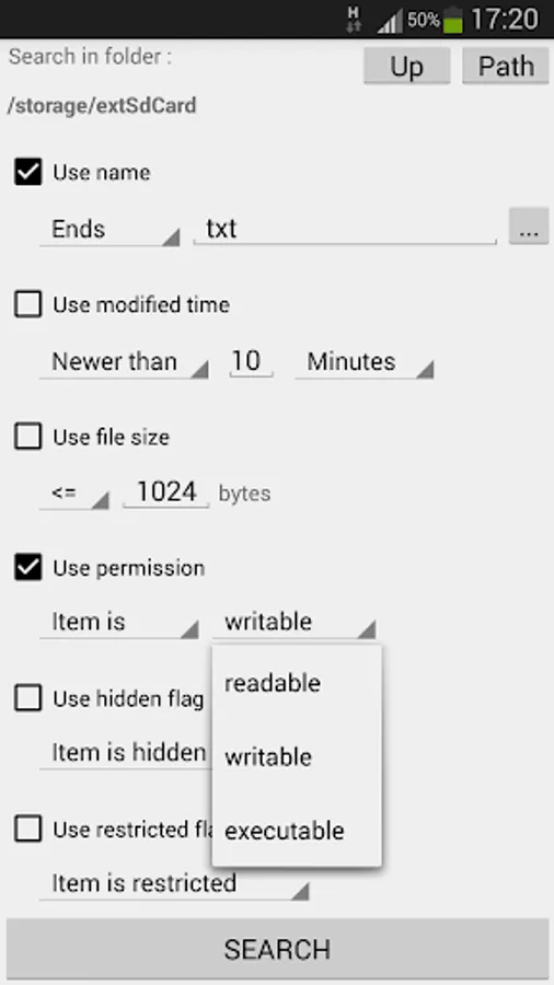It has a very extensive search function where, for example, it is possible to have two conditions on file/folder name.