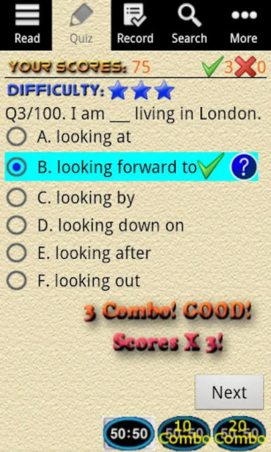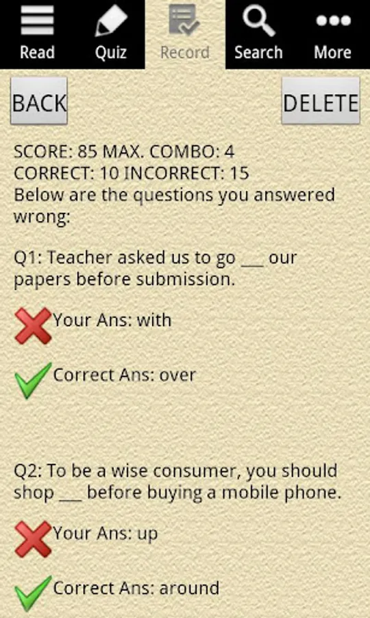 ★ DETAILED test result: It shows which questions you answered incorrectly, score, max. combo (Max. number of questions answered correctly consecutively), date and time of the test. Better still, it shows your top 30 frequent mistake questions too! It is useful for your revision and interesting to challenge with your friends!