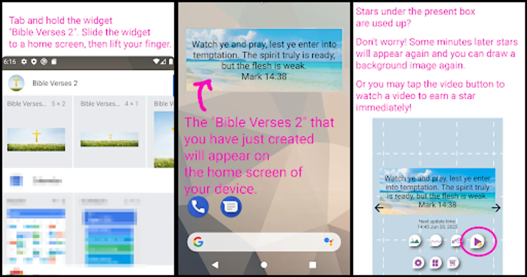 ●Please only put 1 "Bible Verses 2" widget on the homescreen of your device