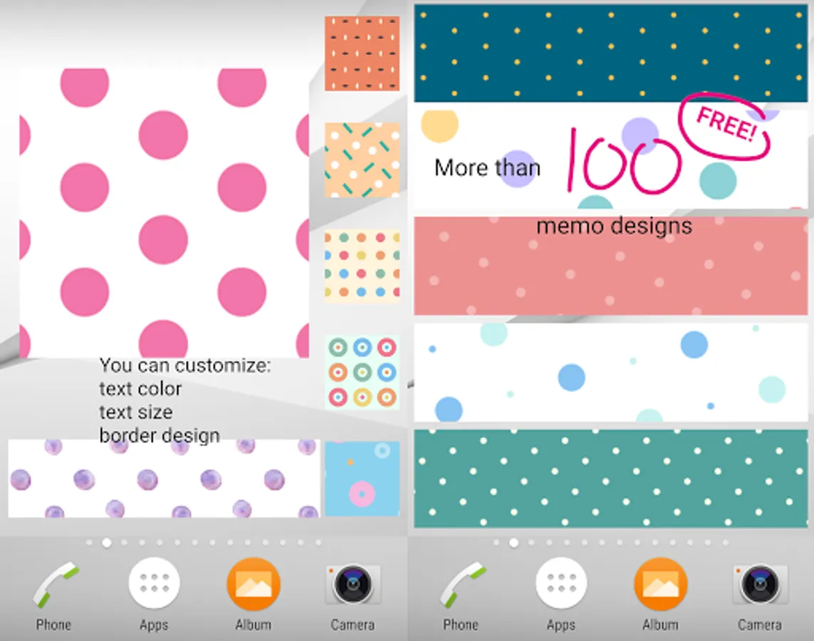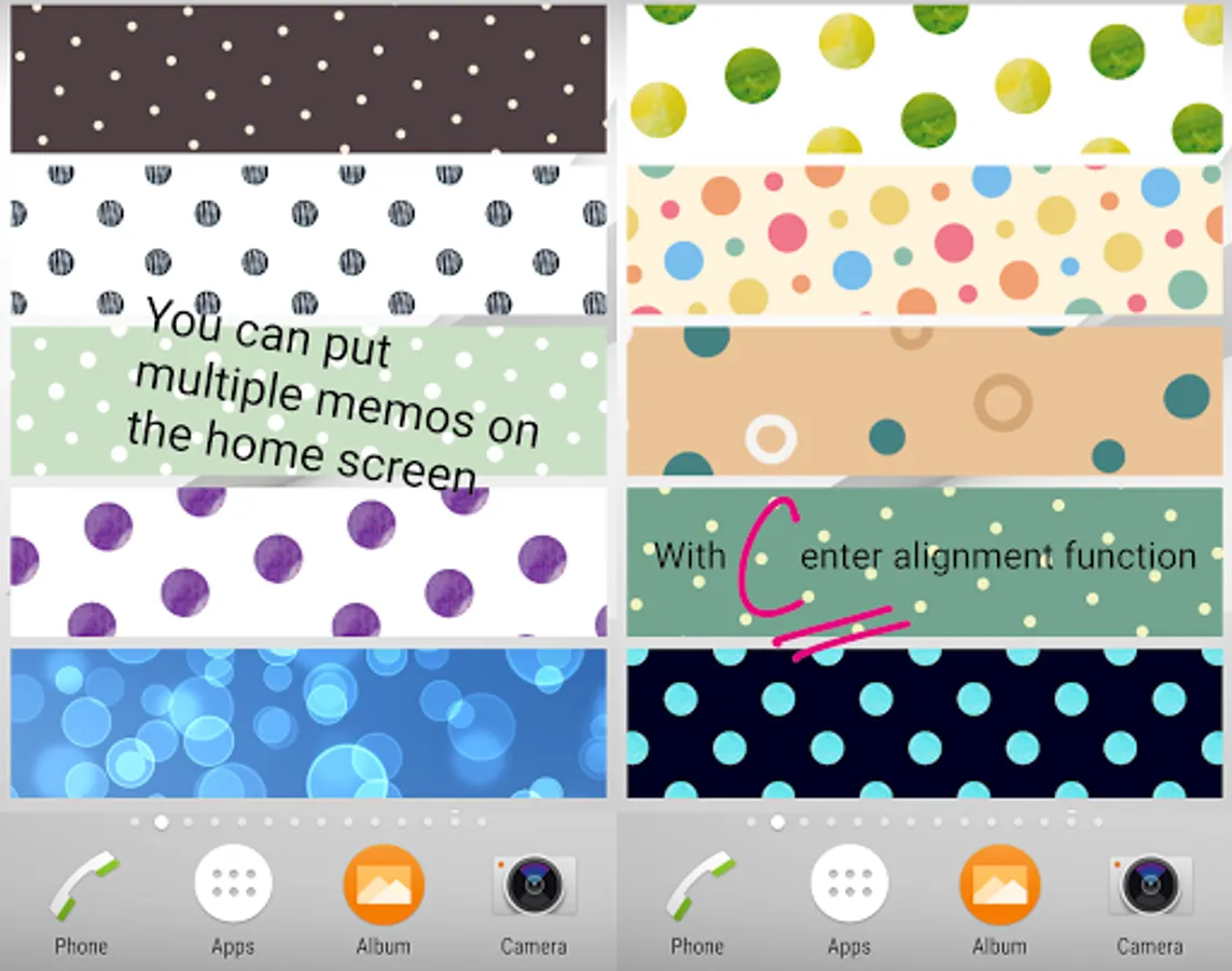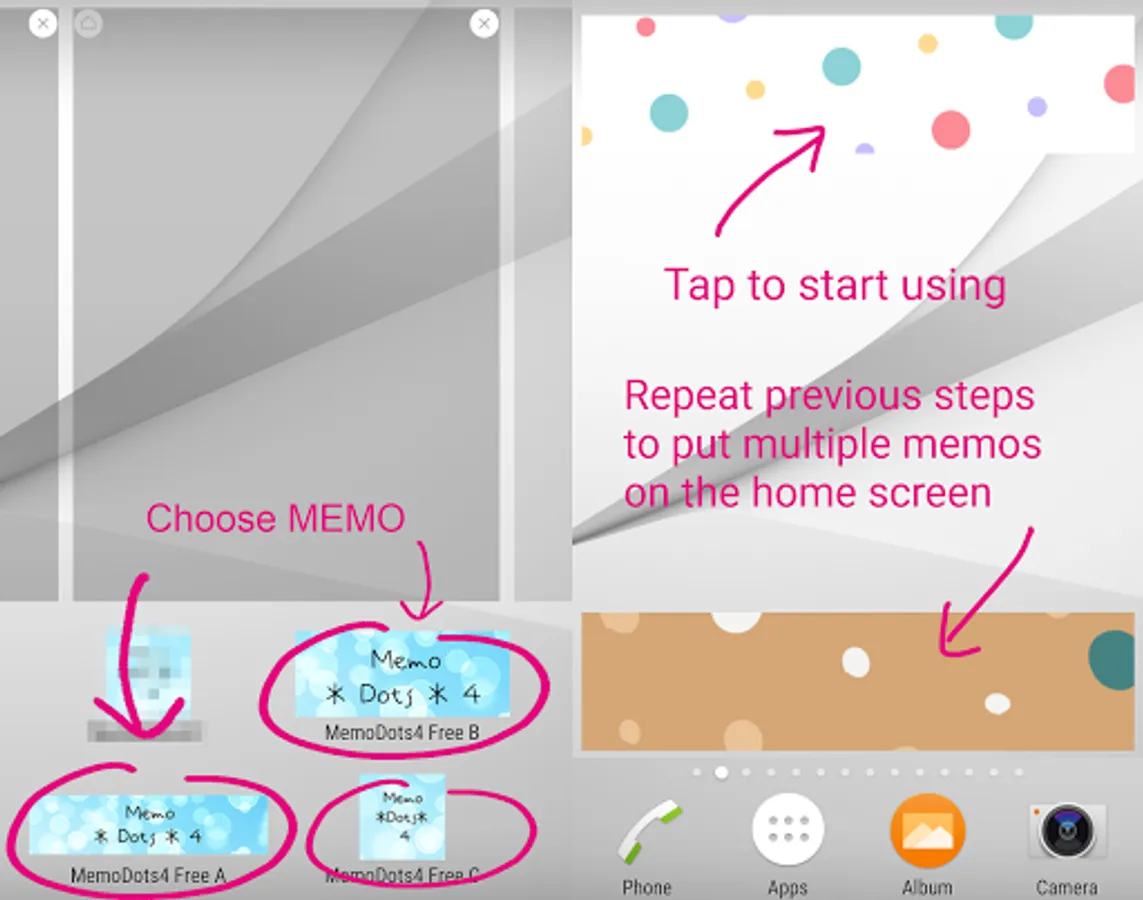 3. Touch and hold the widget "Memo Dots 4 Free". You'll see images of each Home screen.