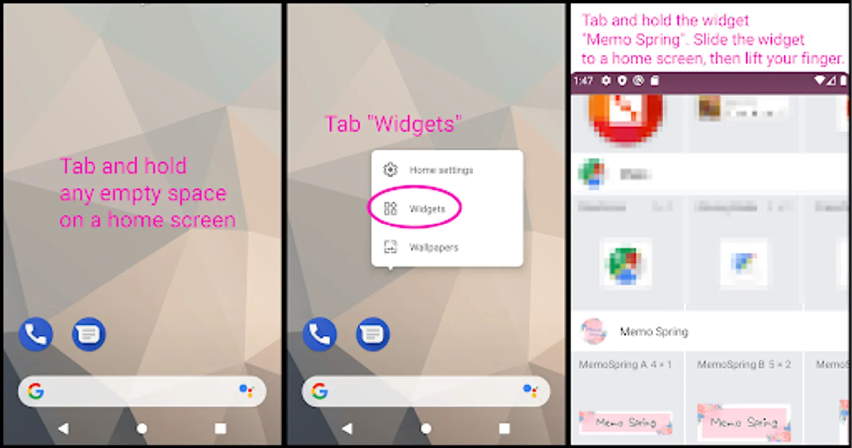 3. Touch and hold the widget "Memo Spring". You'll see images of each Home screen.