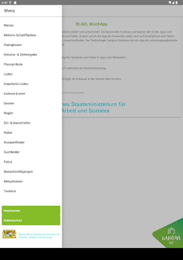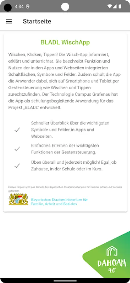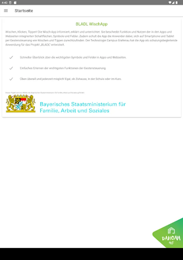 Swipe, click, tap! The wipe app informs, explains and teaches. It describes the function and use of the buttons, symbols and fields integrated in the apps and websites. The app also trains users to find their way around on smartphones and tablets using gestures such as swiping and tapping. Technologie Campus Grafenau developed the app as a training application for the "BLADL" project.