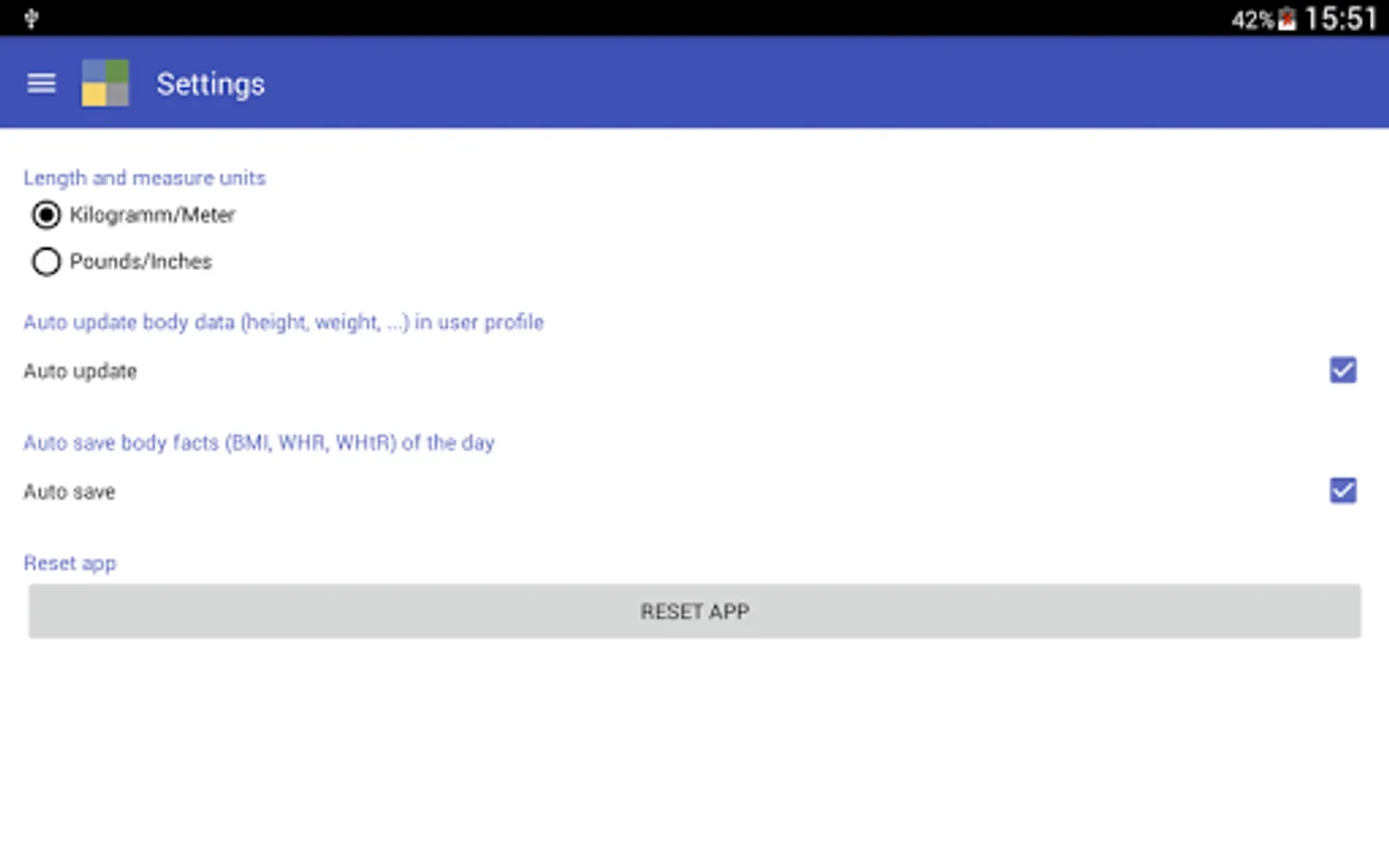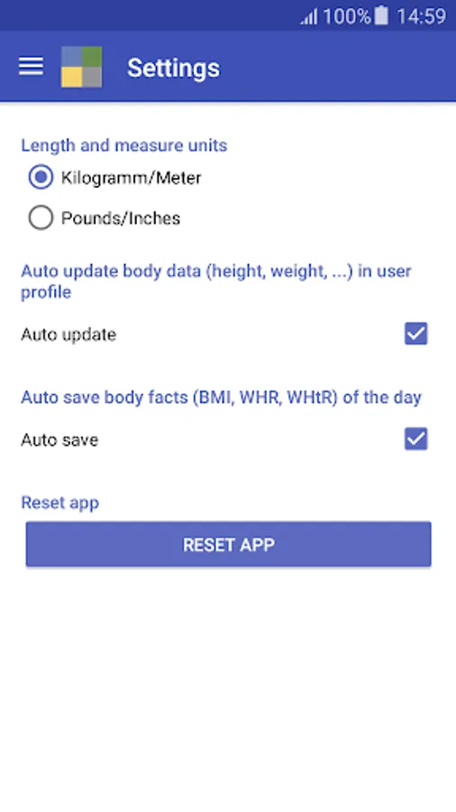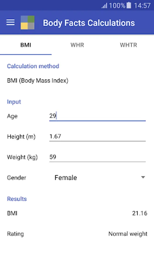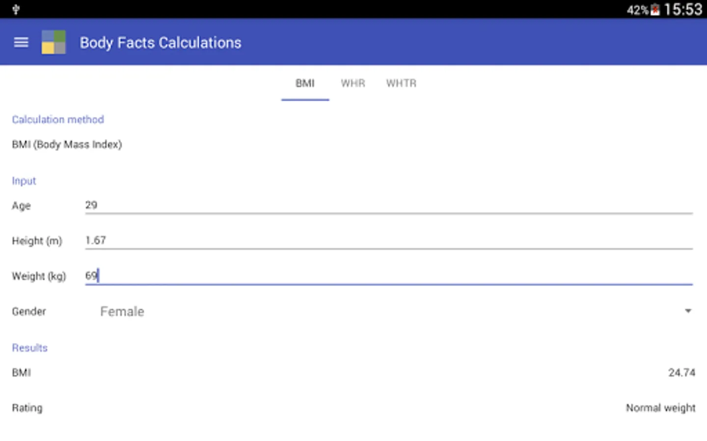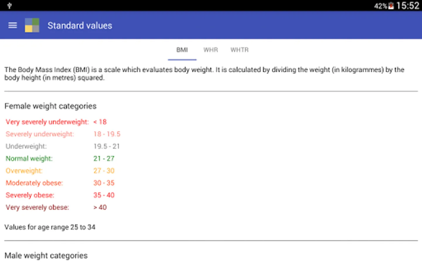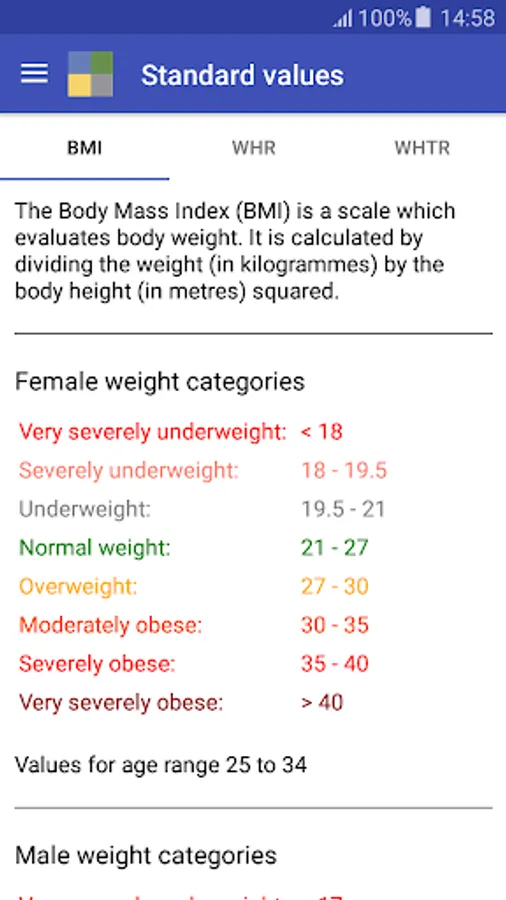 • The app does not claim to provide scientifically usable evidences. Therefore too many possible interpretations of the calculated BMI, WHR and WHtR values exist.