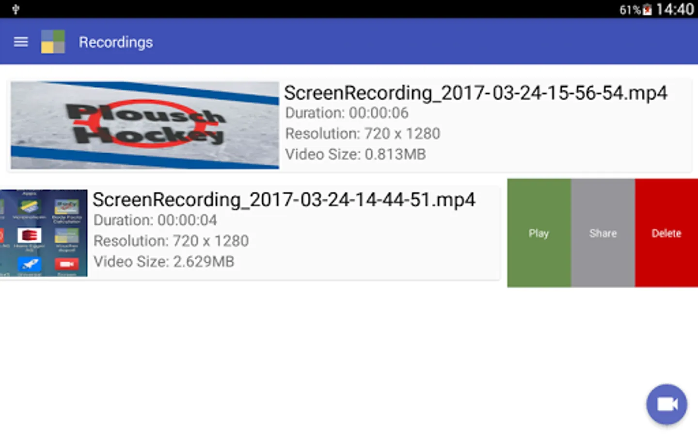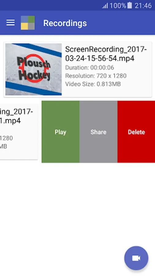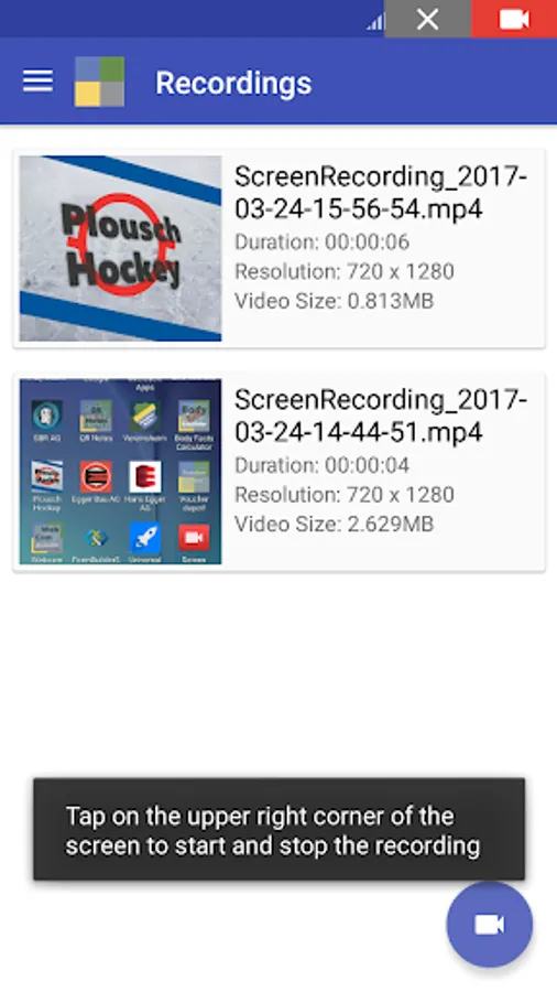 To stop a recording, simply touch the upper right corner of the screen. All recordings are stored directly on your device and can be played, deleted or shared with others via social media, email, messenger etc.
