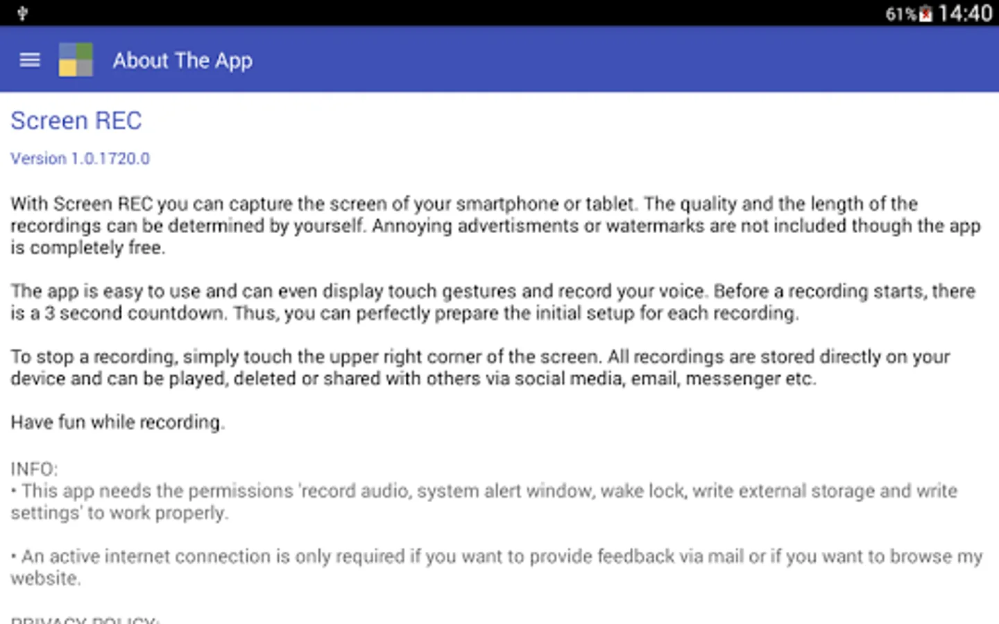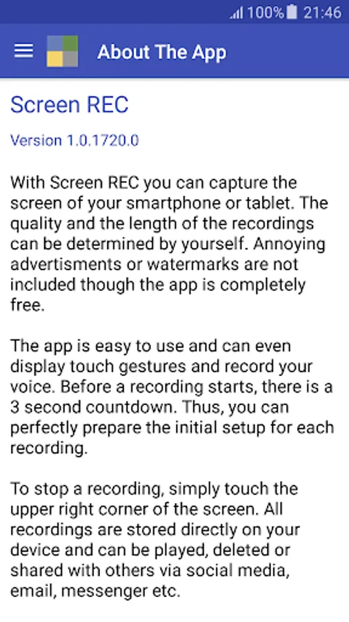 With Screen REC you can capture the screen of your smartphone or tablet. The quality and the length of the recordings can be determined by yourself. Annoying advertisments or watermarks are not included though the app is completely free.