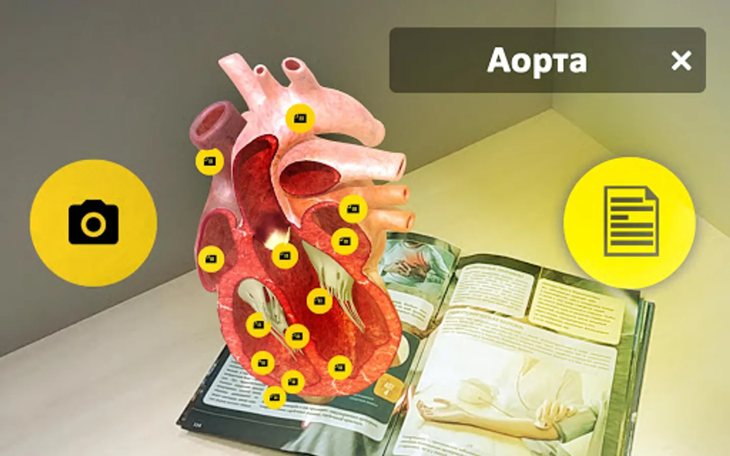Augmented reality technology turns pictures into 3D objects that move in space. Using the buttons of a simple interface, you can rotate, enlarge and reduce models. The sound accompaniment of the melody enhances the scenes of visualization and perception of what is seen. It is also possible to listen to additional material or use spatial annotations about the most interesting fact.
