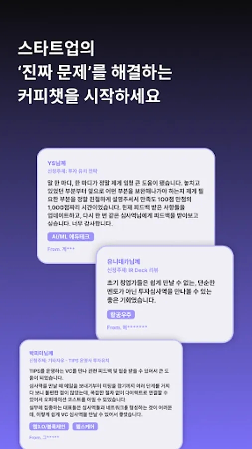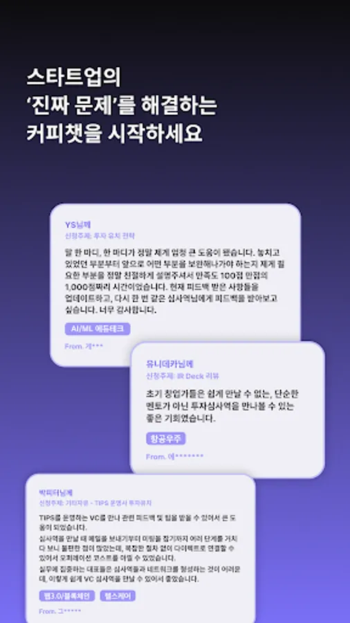 **커피챗을 통해 창업가들은 경험이 풍부한 현직 VC 심사역들에게 질문을 하고, 솔직한 피드백을 들으며 ‘진짜 문제’를 효율적으로 해결합니다.**