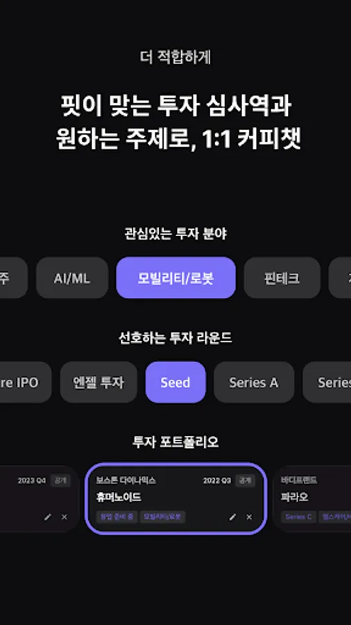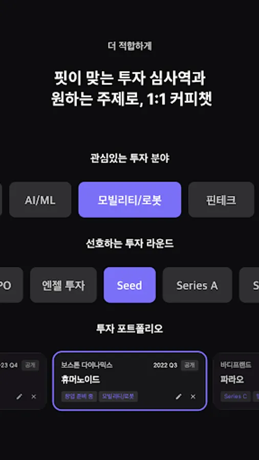**핏이 맞는 투자 심사역과 1:1로, 원하는 주제로 대화하세요.**