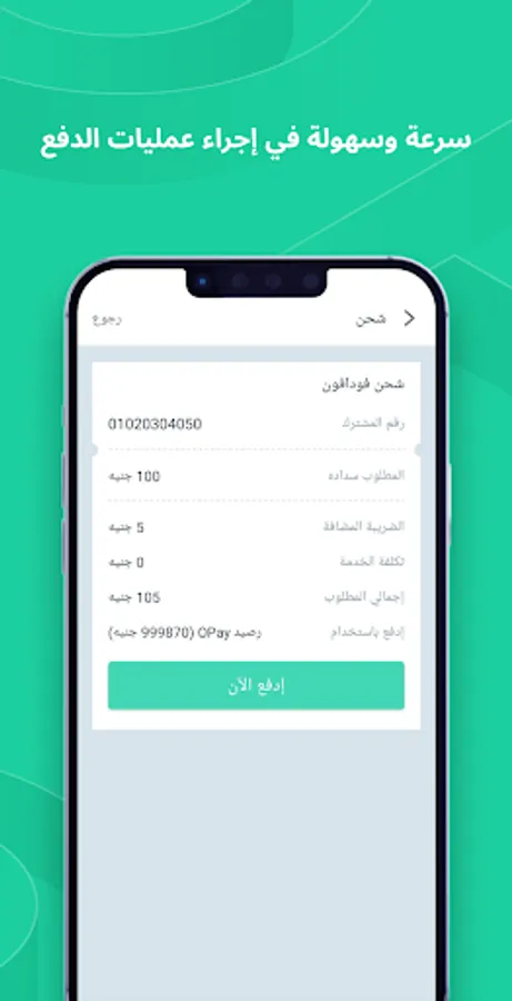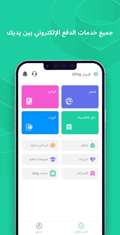 OPay for electronic payment services provides customers with all electronic payment services available throughout the Arab Republic of Egypt, such as payment services for telecom companies' charging cards, bills, air freight and packages. It also provides Internet and landline bill payment services and donations.