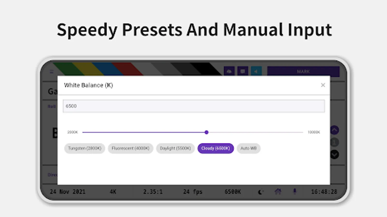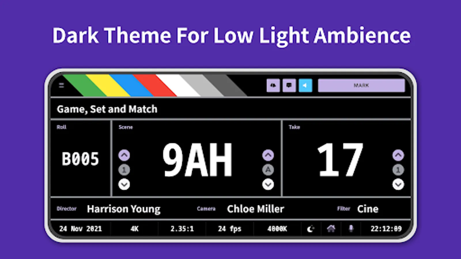 No more sore throat caused by yelling. We've got you covered. Simply tap on Mark and we will take it from there. The clapperboard can call out the scene and take number, and shout Mark for you, followed by the classic or soft clapping sound, with indicating lights.