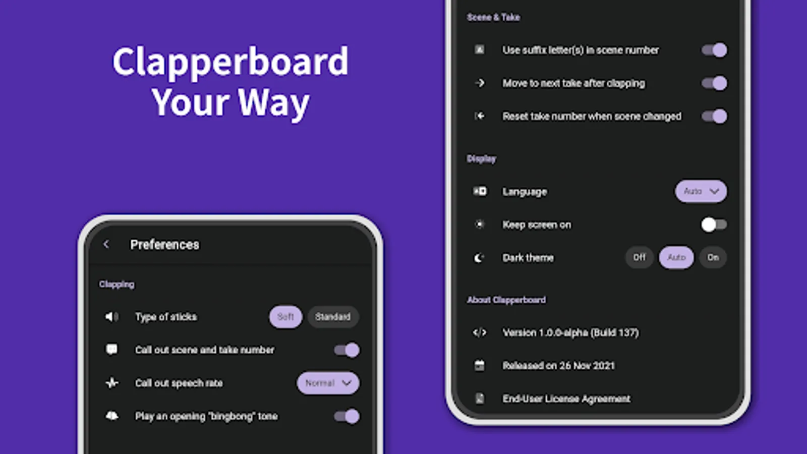 The clapperboard is here to help, not to take the focus away from you. No matter shooting in harsh sunlight by the beach or telling a romantic story under the stars, just turn dark theme on or off to match the ambience.