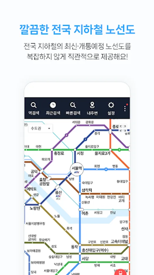 - Provides subway information in the metropolitan area, Busan, Daegu, Gwangju, and Daejeon.