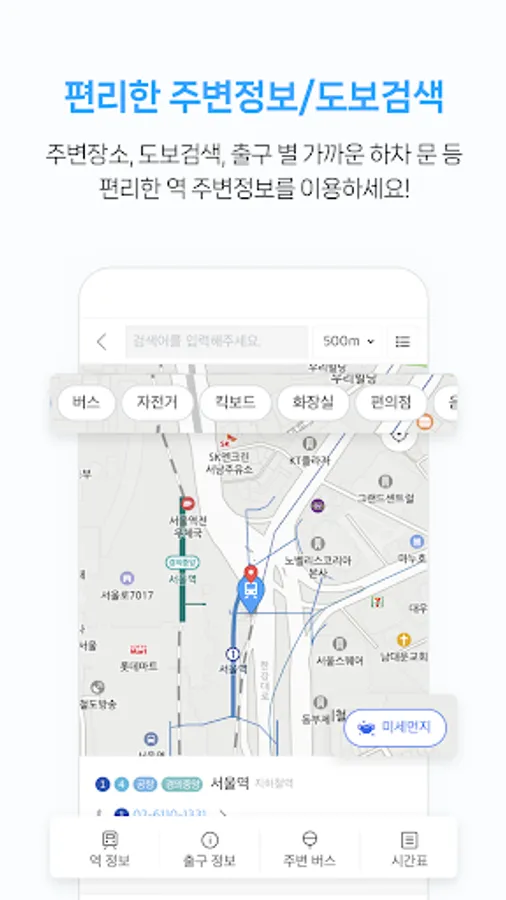 It provides smart information such as searching for places (bus, bicycle, scooter, restroom, convenience stores, etc.) around me/subway station and finding walking directions in a neat design.