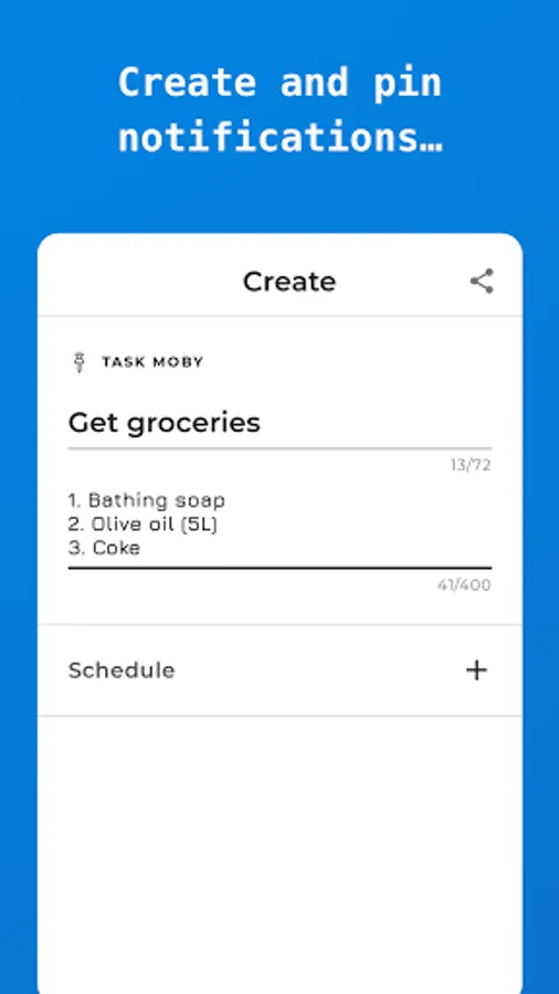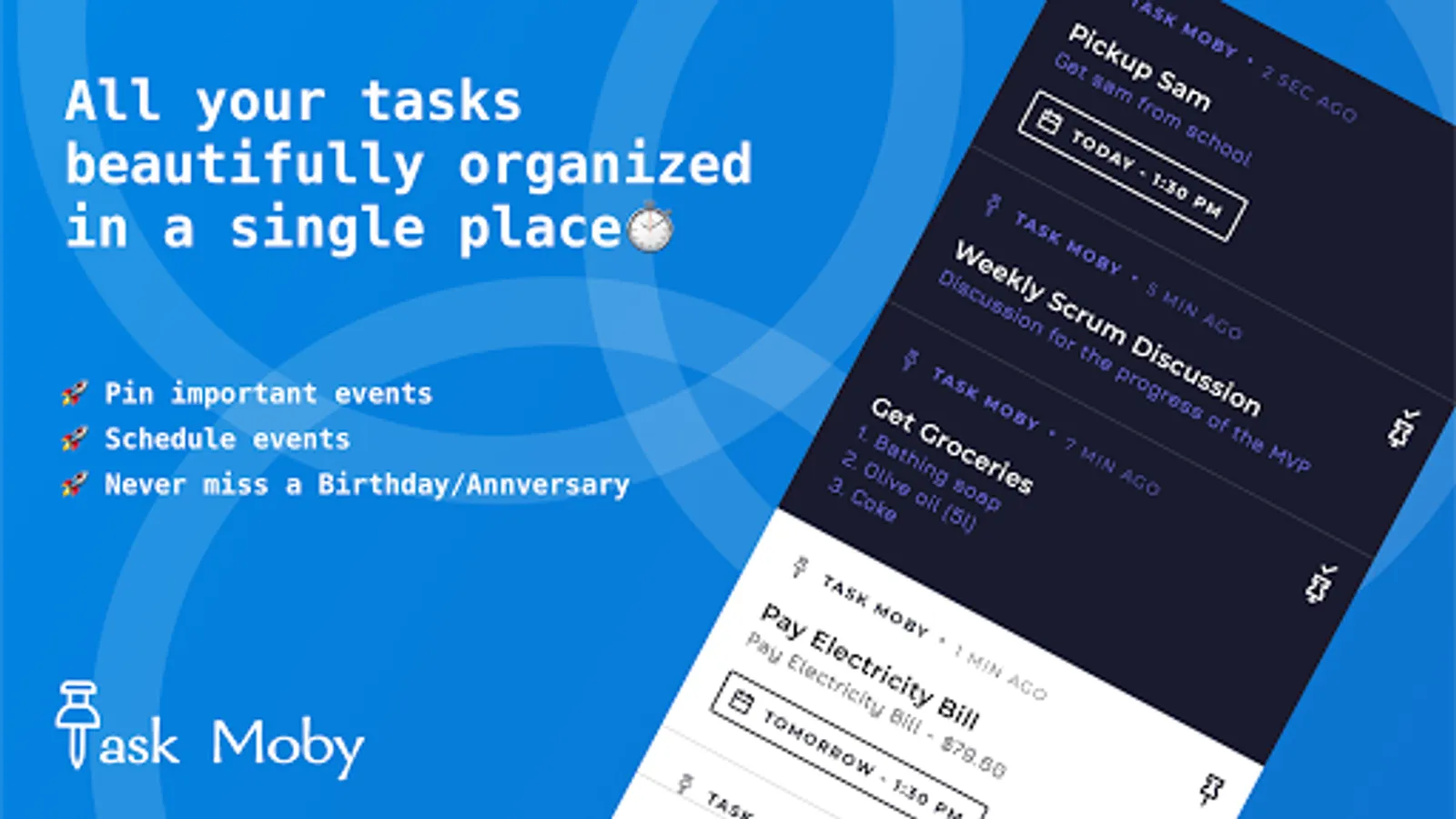 Reminder apps send a notification or ring alarm to which a user mostly dismisses and in-spite of getting the reminder forgets to do the task as it gets out of the mind after a few minutes of dismissing the reminder. In comparison Task Moby helps you pin notes or reminders as notifications so that it constantly reminds you every time you unlock your phone or swipe down the notification panel.
