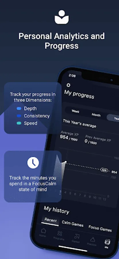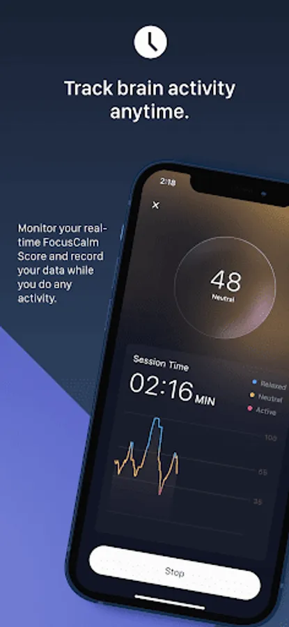 • Depth - Measures your peak FocusCalm score to indicate how calm your brain became during an exercise or meditation.