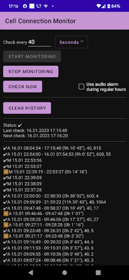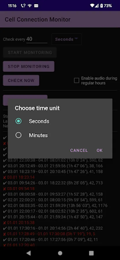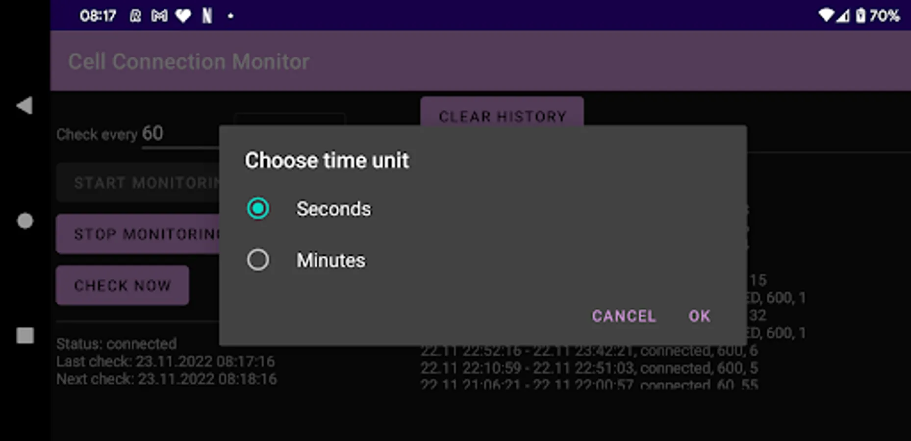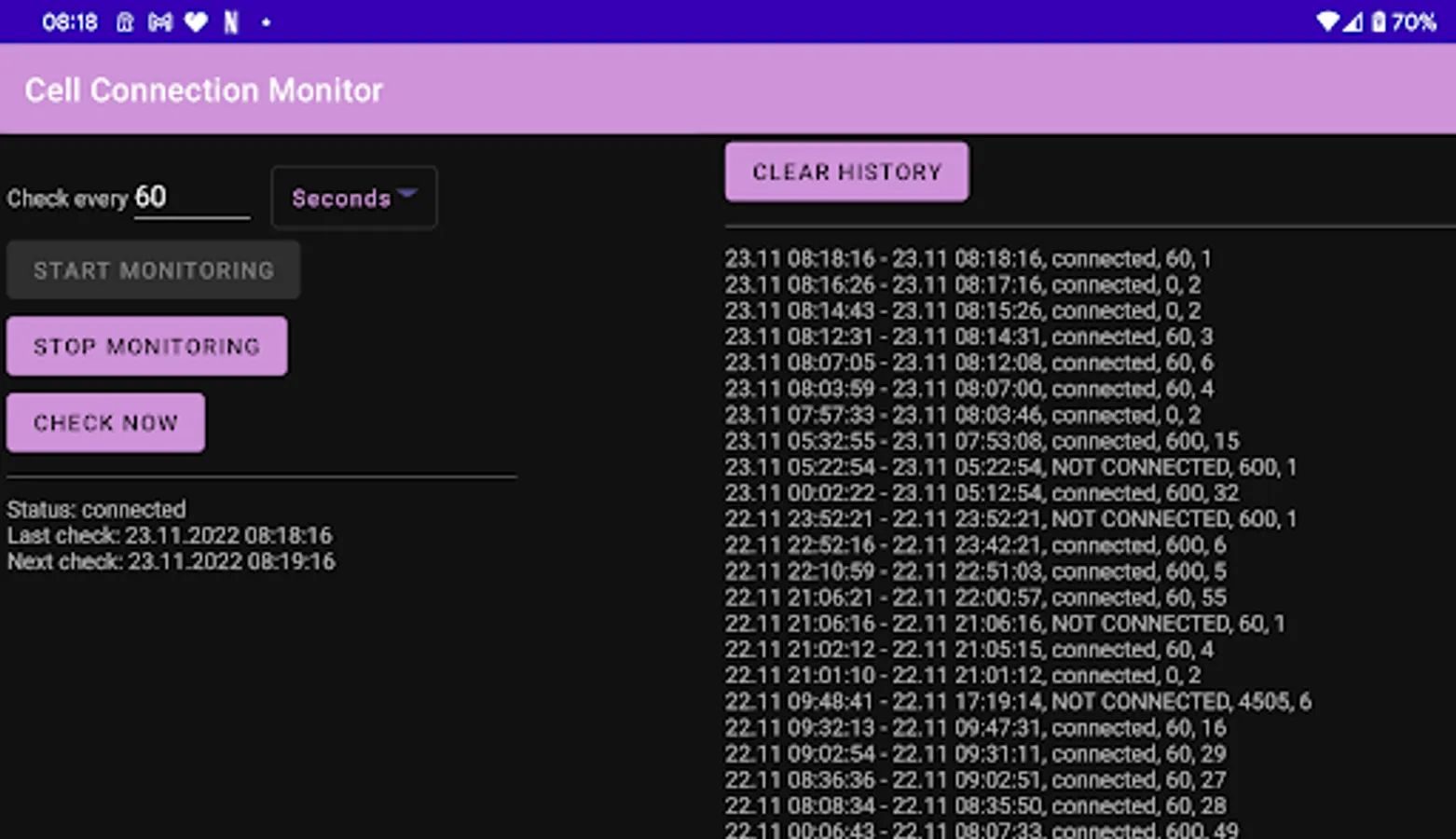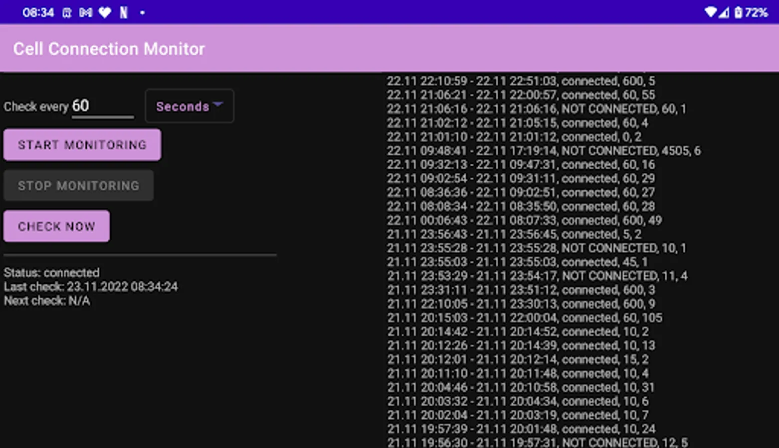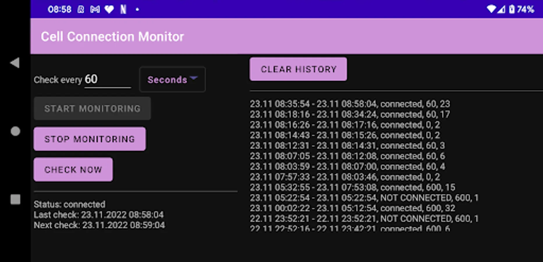 Cell Connection Monitor allows you to know as soon as you need if your connection no longer works, by making short requests over the cellular network and beeping when those requests fail.