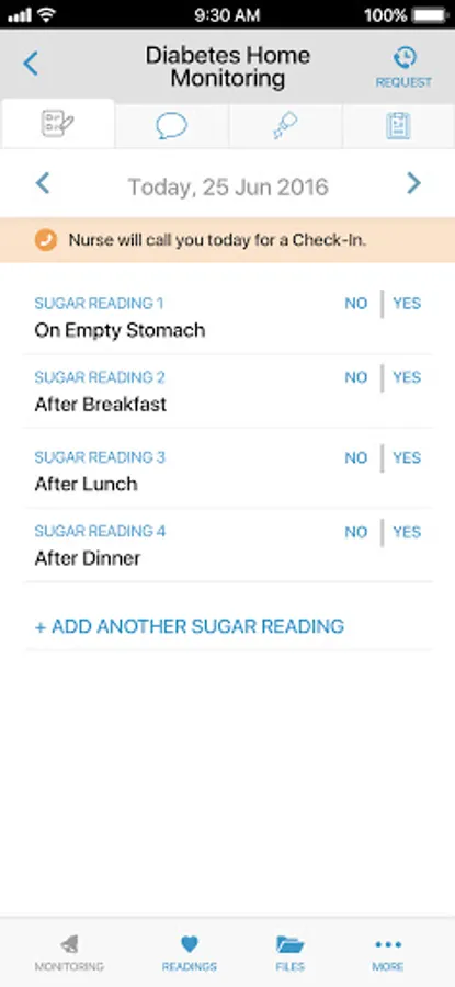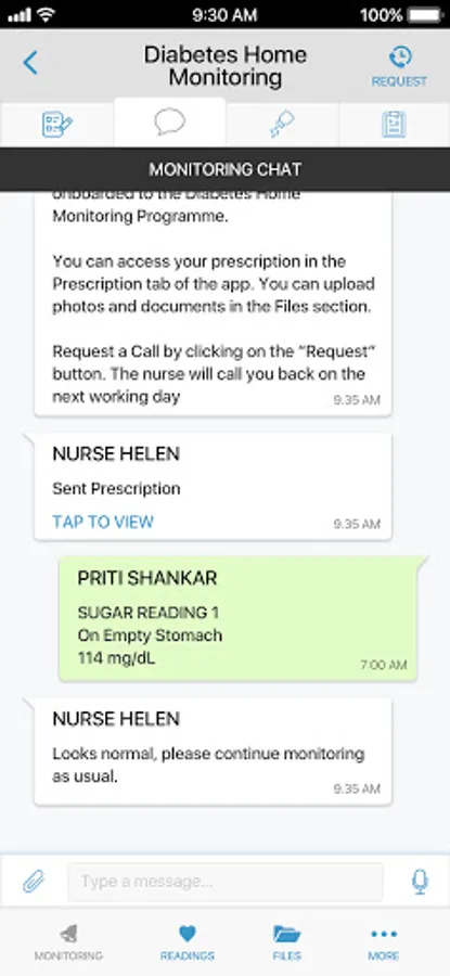 You can use the Reya Patient App for SMBG (self monitoring of blood glucose). We automatically set up your sugar reading schedule, based on your doctor’s prescription. Just add your sugars as per the pattern. You will receive a prompt response from the nursing team for any abnormal readings. If needed, nurses will connect you directly to your doctor. You can also use this app to chat with the care team, view your latest prescriptions, and maintain logs of vitals (like weight and blood pressure).