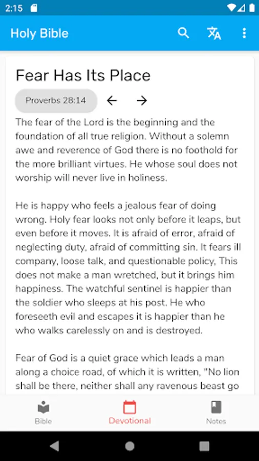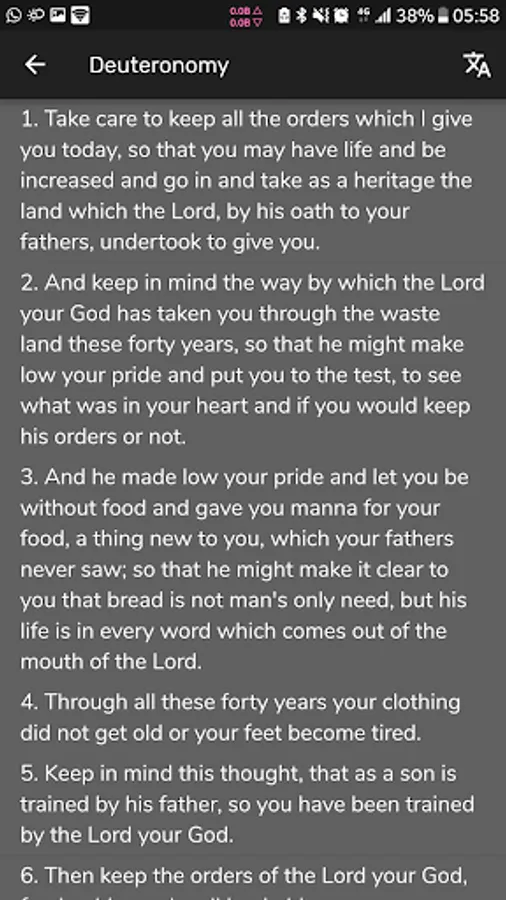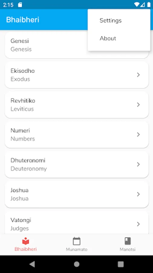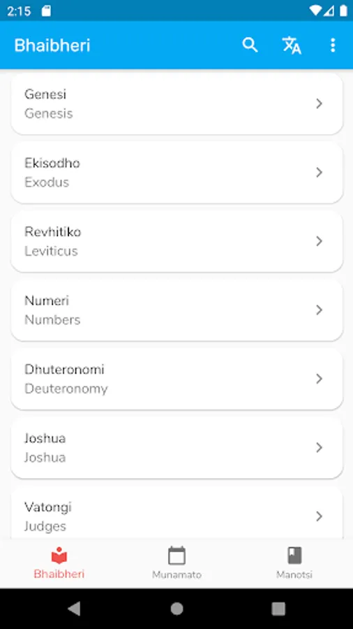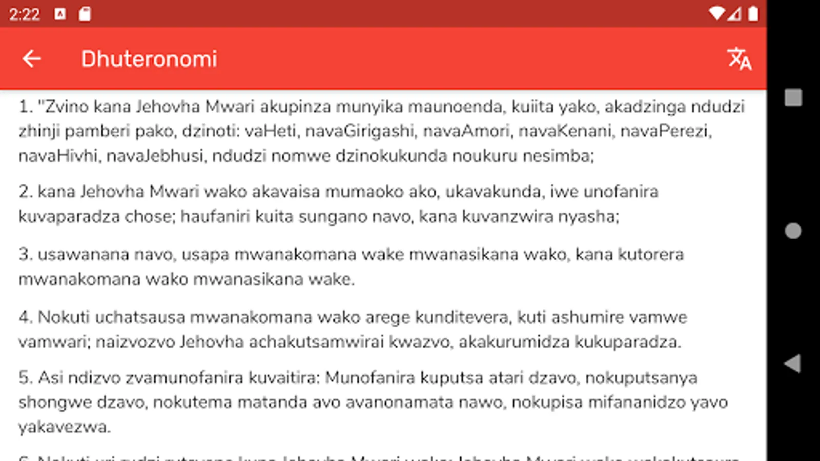 This app contains the text for the Holy Bible in English and Shona languages. Click the translate icon to switch between the available languages on demand.