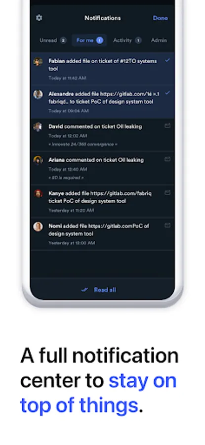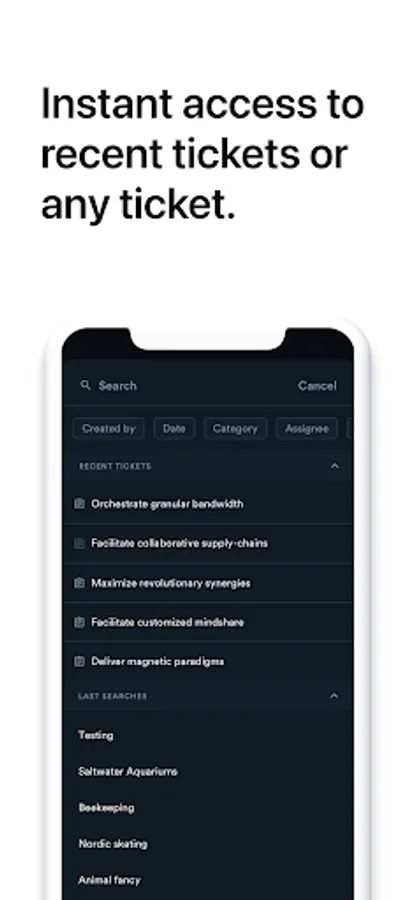 Stay on top of things thanks to a full notification center and get instant access to recently open tickets. Full access to any ticket via an instant search.