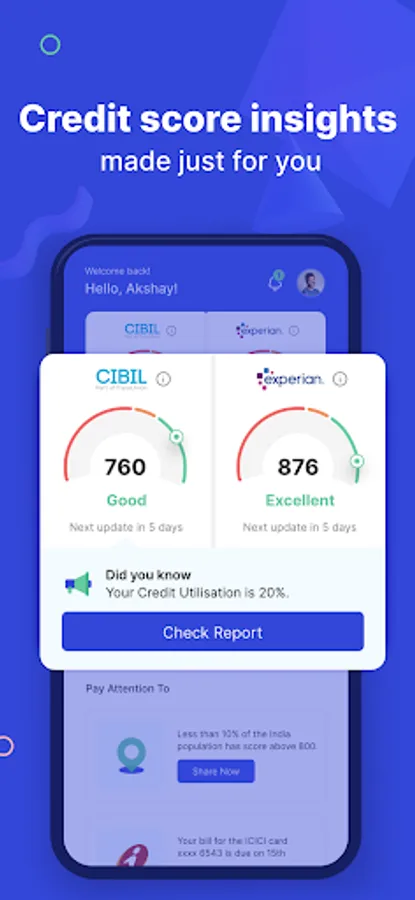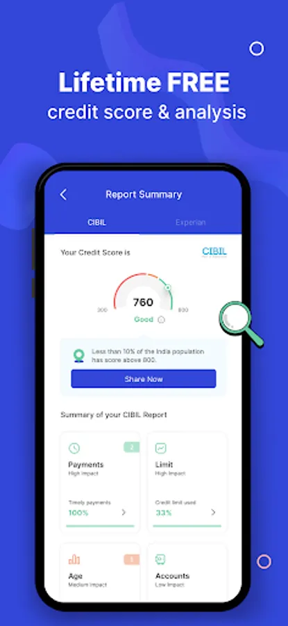On the latest version of OneScore, you can get a bird’s eye view of all your credit & loan accounts under one tab. You can still check your Experian & CIBIL score for free while we share customised actions to help you build better credit history or credit record.