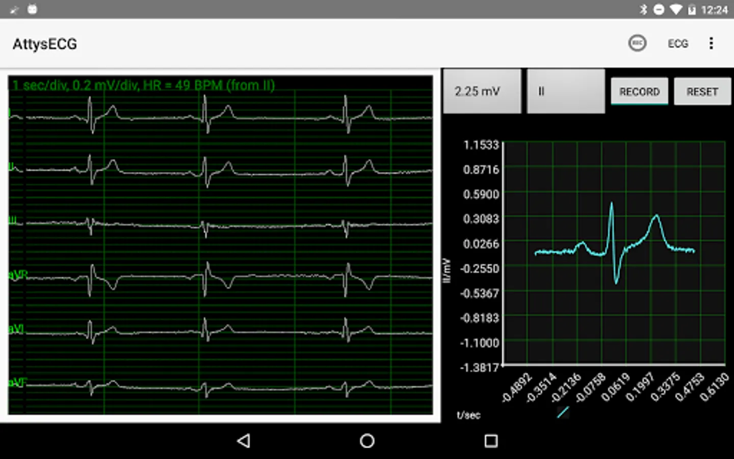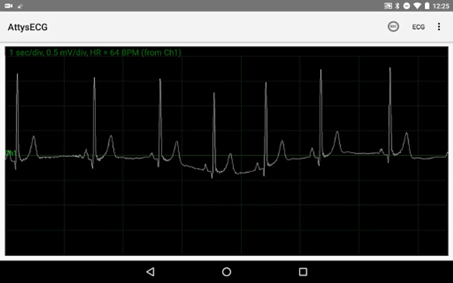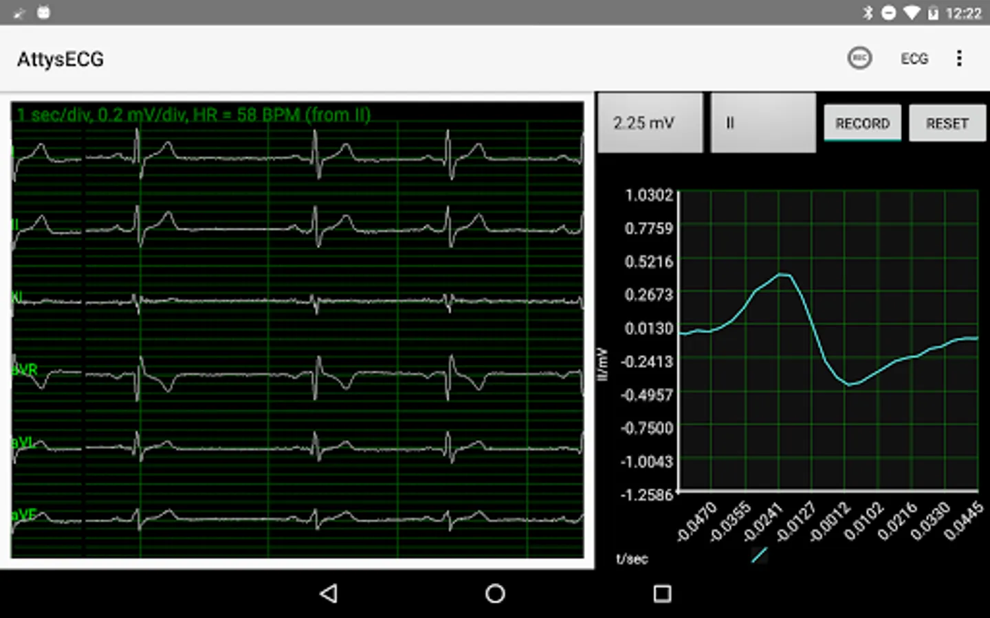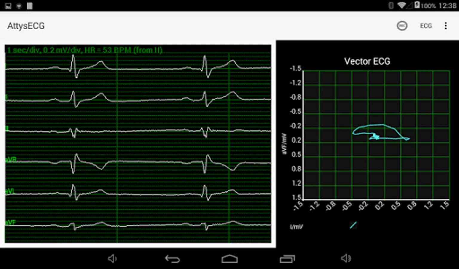 AttysECG is the ECG app for the Attys (http://www.attys.tech) which displays the Einthoven leads I,II,III and the augmented leads aVR, aVL, aVF.