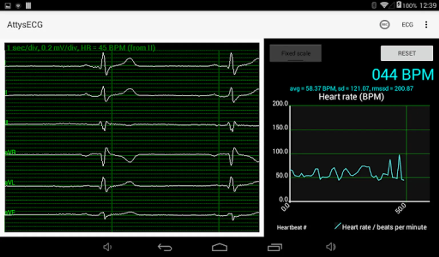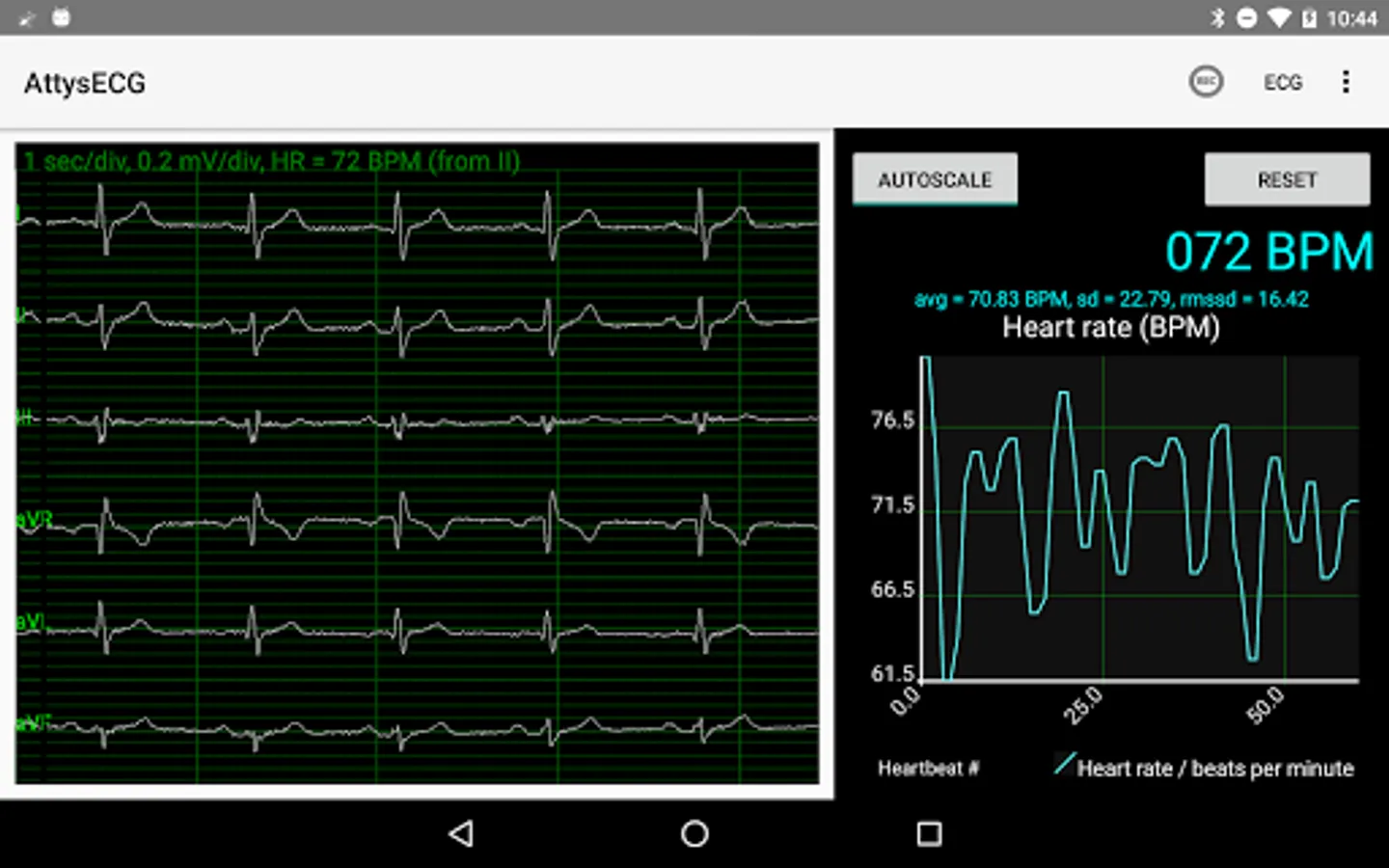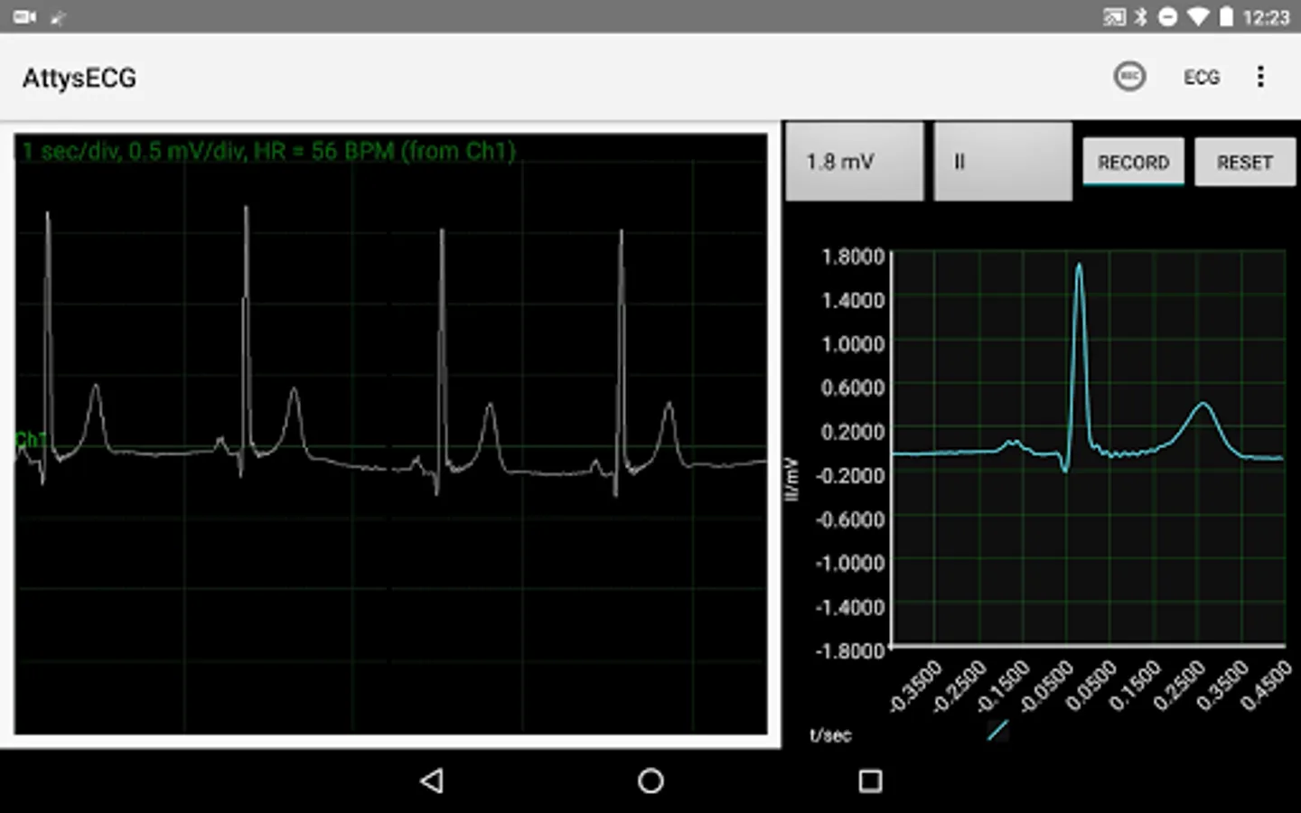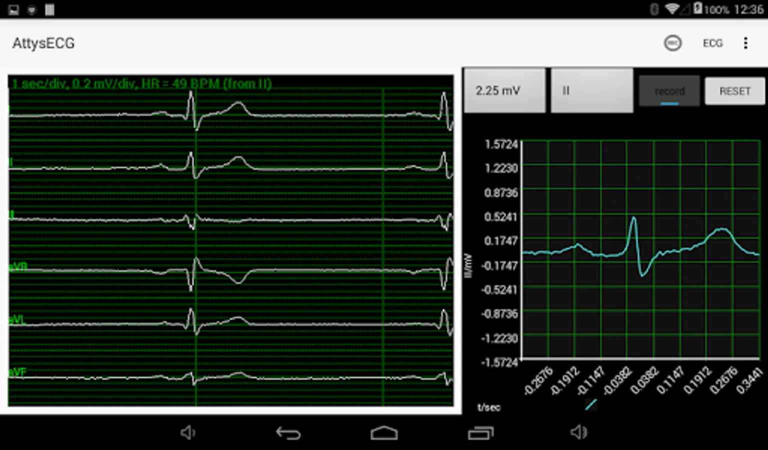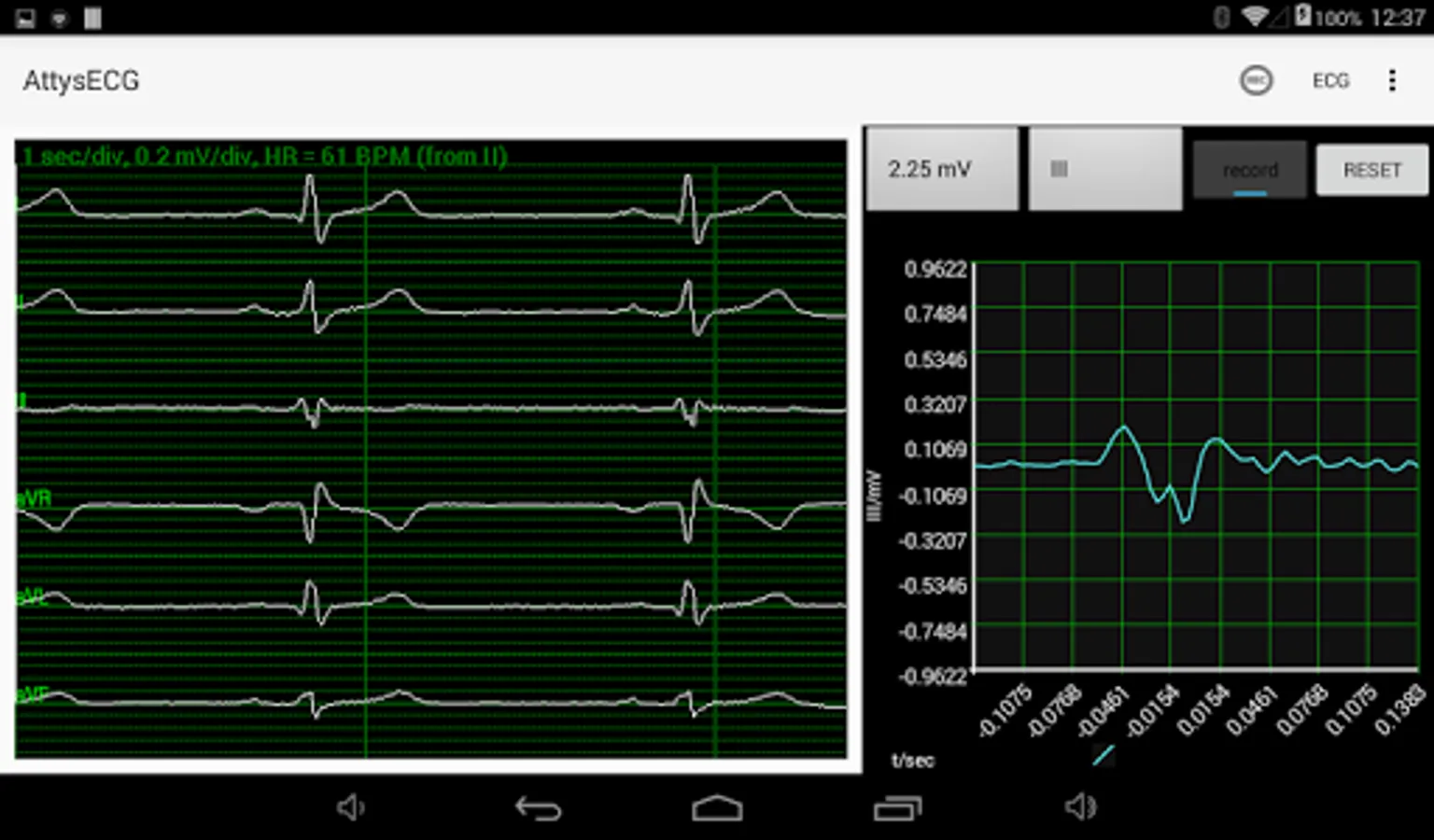 AttysECG is the ECG app for the Attys (http://www.attys.tech) which displays the Einthoven leads I,II,III and the augmented leads aVR, aVL, aVF.