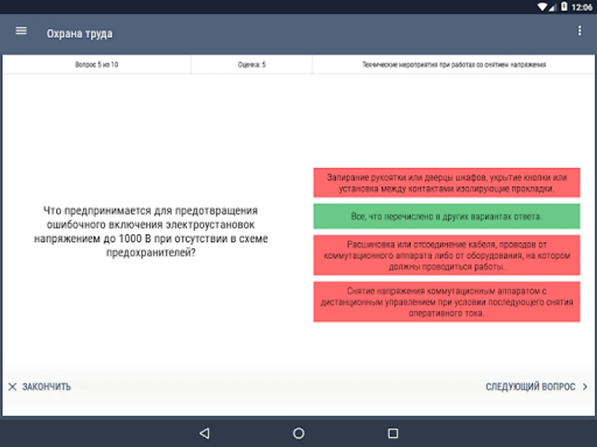 Knowledge control of the test person. It is impossible to complete the test of knowledge before the end of the test, the menu is not available, at the end of the test the report also contains the name of the test subject.
