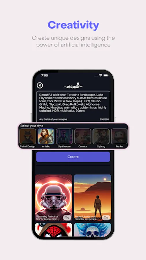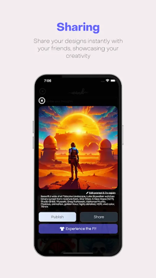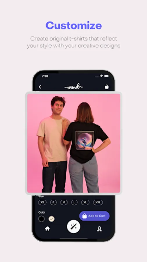 Introducing Wand AI: the easiest way to turn words into art and wear it with pride! With just a few taps, create beautiful, unique images from your favorite quotes, song lyrics, or personal messages. Watch as Wand AI transforms your words into stunning designs, ready to be printed on high-quality t-shirts. Express yourself creatively and showcase your personalized art on social media or proudly wear it as a fashion statement. Try Wand AI today and let your words become wearable works of art!