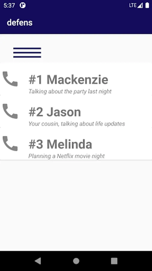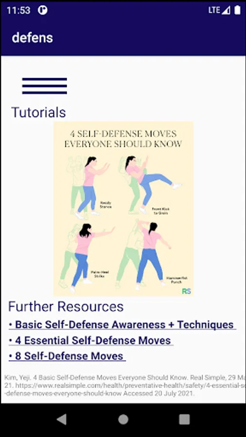 There are three main features of the app, which can be used when in a dangerous or unsafe situation. First is the personal safety alarm, which will activate a loud noise to attract the attention of bystanders and deter attackers. Second is the simulated conversation, in which the user can listen to a phone conversation and follow along, acting as if they are occupied so as to avoid uncomfortable situations. Lastly is the self-defense resource page, which the user can visit to learn more about personal defense tactics.