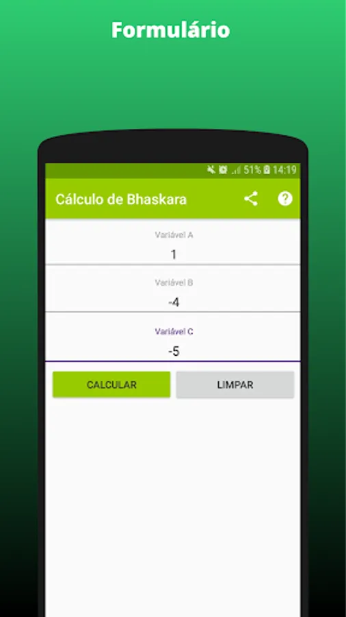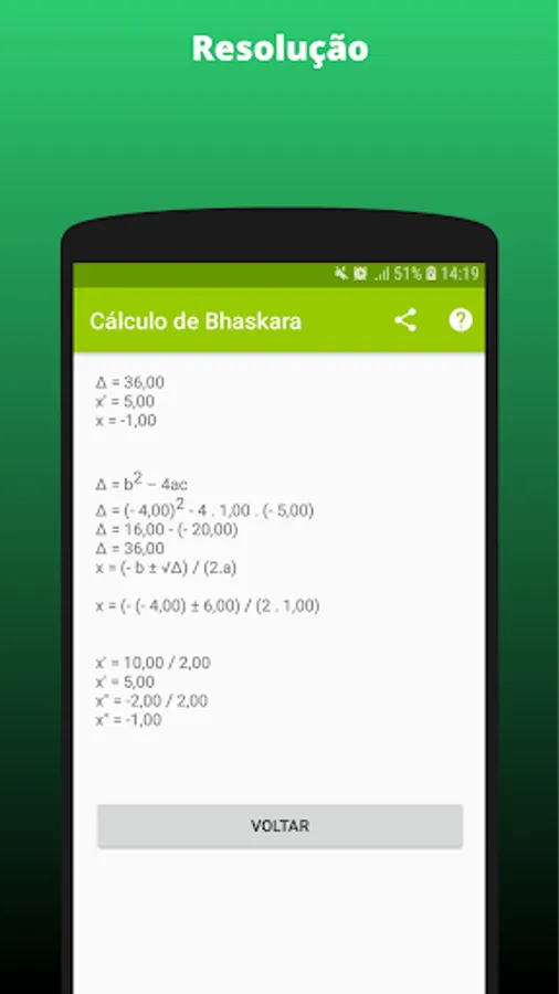 It contains a simple interface for calculating 2nd degree function, where you fill in the values "a", "b" and "c" and the result of the delta, x 'and x "results instantly.