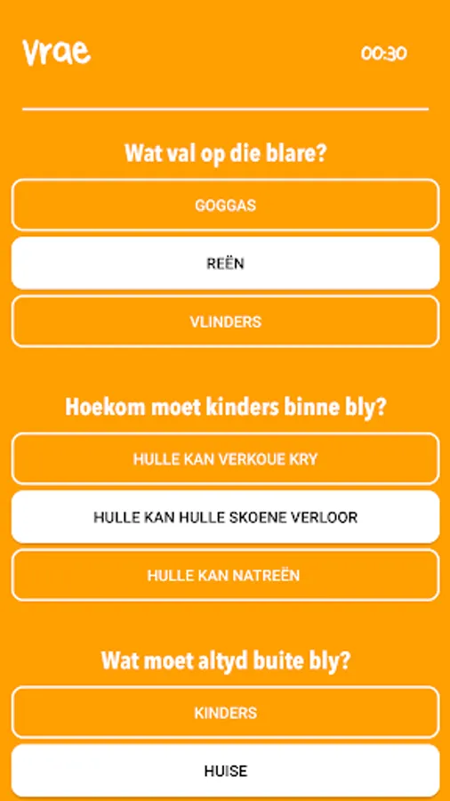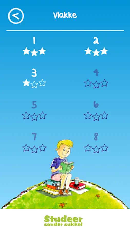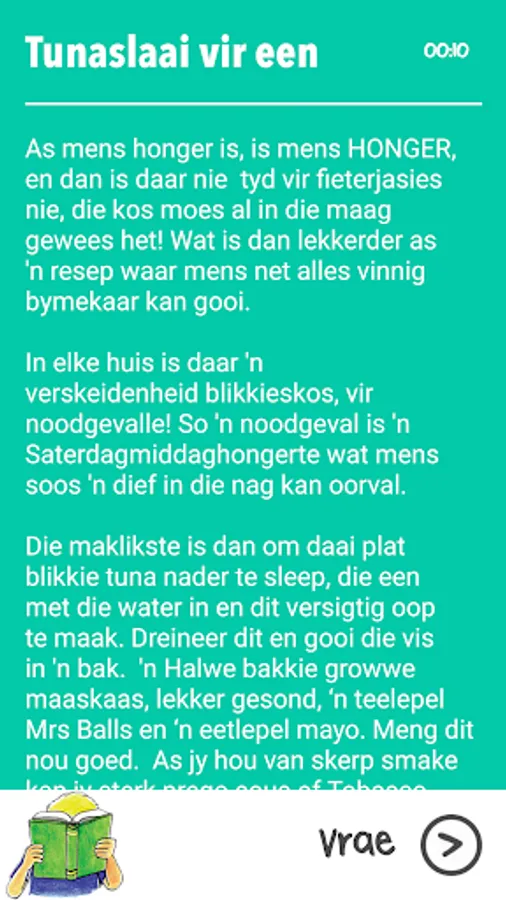 Elke vlak het 3 leesstukke wat humoristiese en interessante inligting bevat, van resepte, gedigte en tongknopers. Nadat elke leesstuk gelees is, moet lesers 3 vrae korrek beantwoord om na ‘n volgende vlak te vorder.