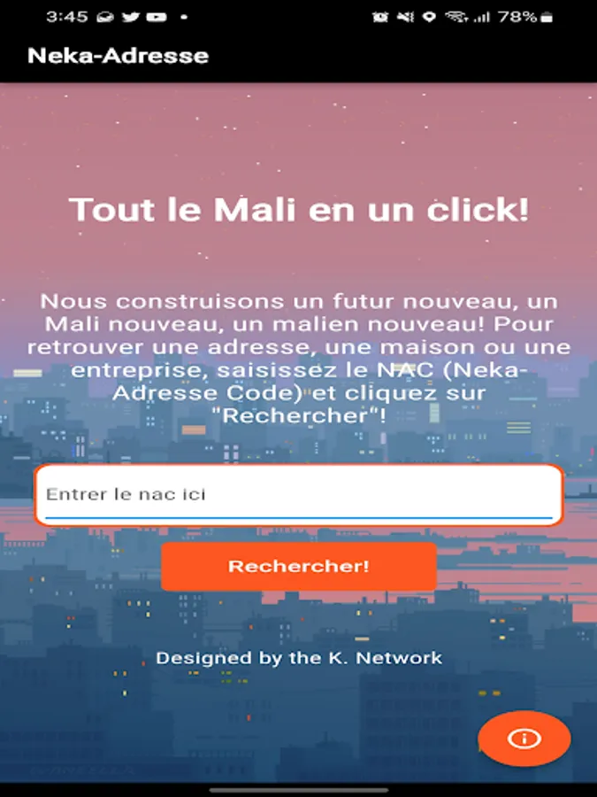 Neka-Adresse allows you to find all the addresses of Mali thanks to their NAC code. The application finds the location thanks to the NAC and allows you to navigate there thanks to Google Maps. This is also the new Mali!