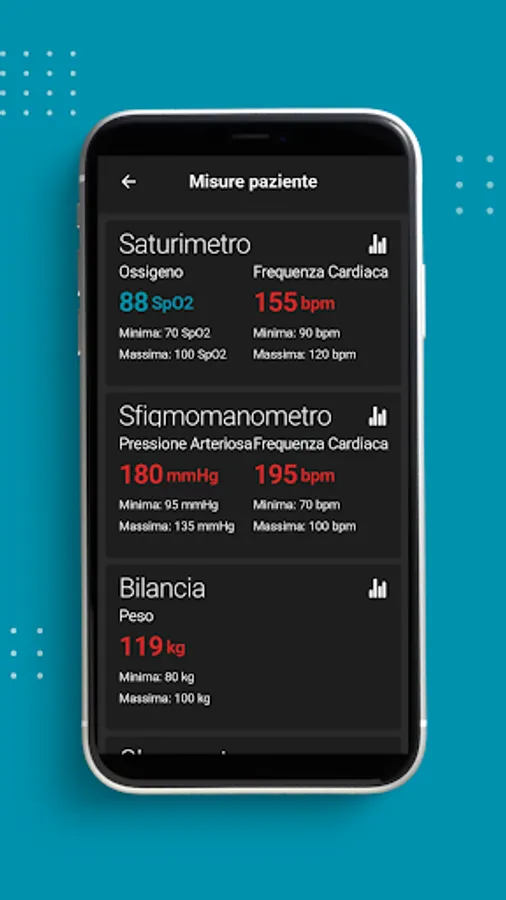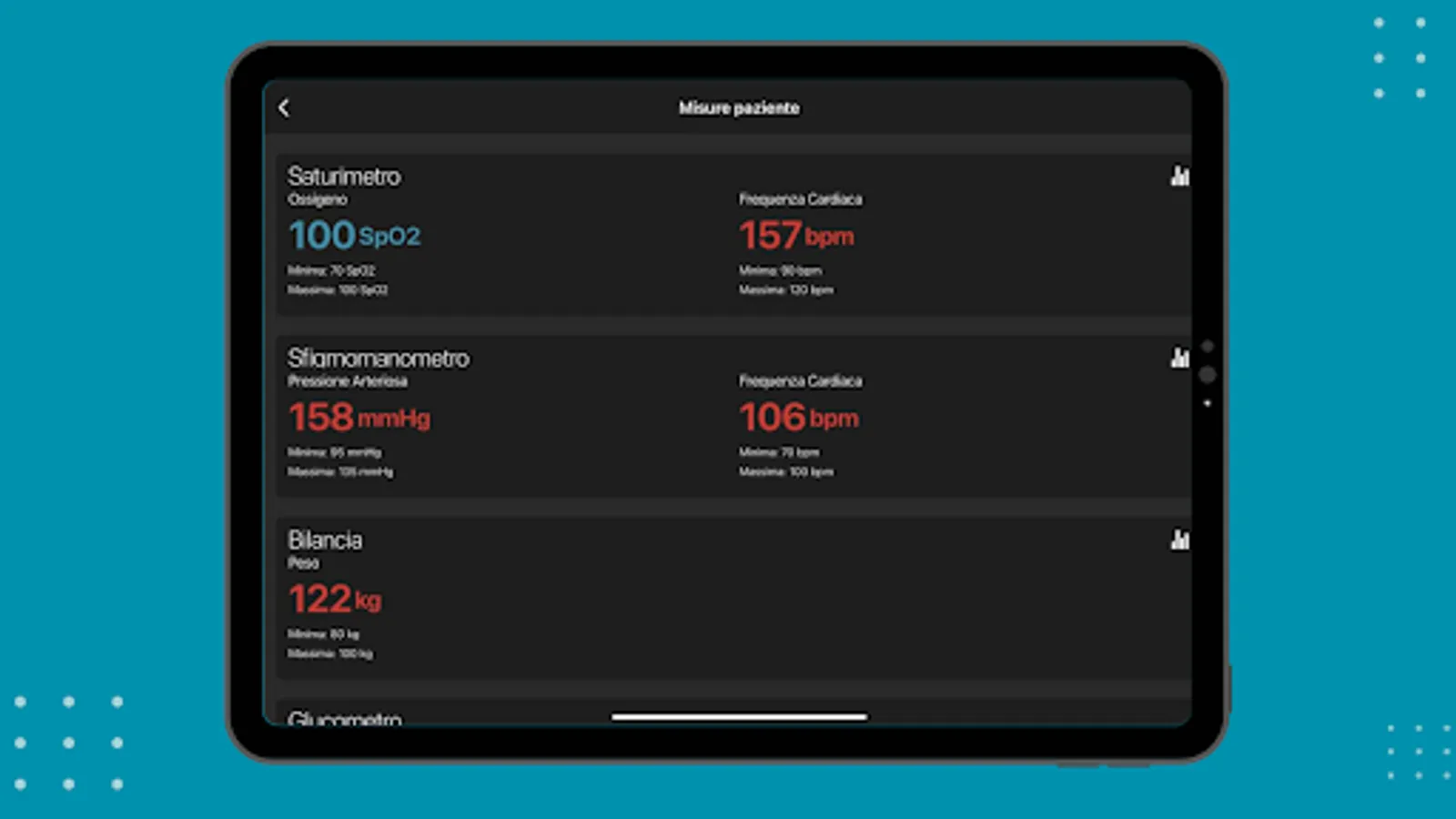 Which parameters to monitor, the detection frequency and the standard thresholds, are defined a priori patient by patient, thus building treatment plans tailored to him. The App will send him a notification every time he has to perform a measurement and, when the parameters go out of the patient's standard range, the doctor is promptly notified via an alerting system and can immediately get in touch with him, thanks to the chat system. and television integrated into HCT, improving doctor-patient dialogue and the quality of health care.
