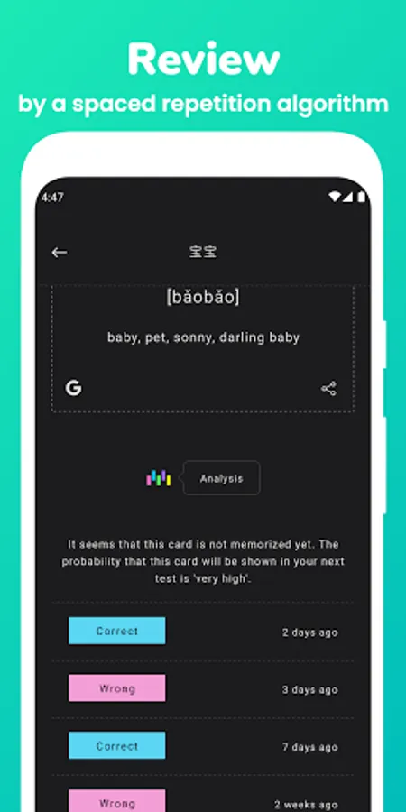 -By comparing your habit to other users, AI continuously personalizes the level of difficulty and the amount of your test for effective vocabulary memorization.