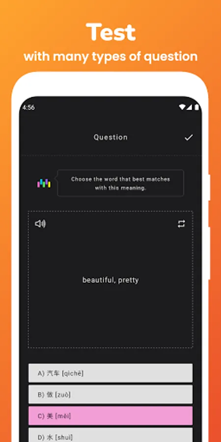-Support many types of test for learning Chinese (Multiple choice question, listening, matching, flipping flashcard and etc.)