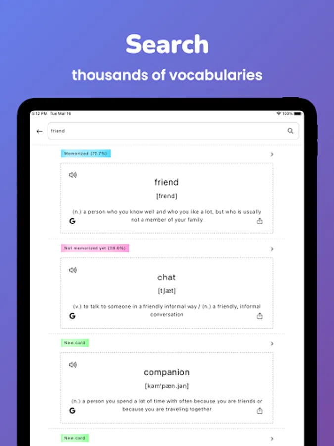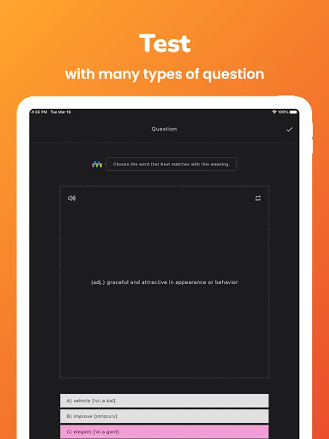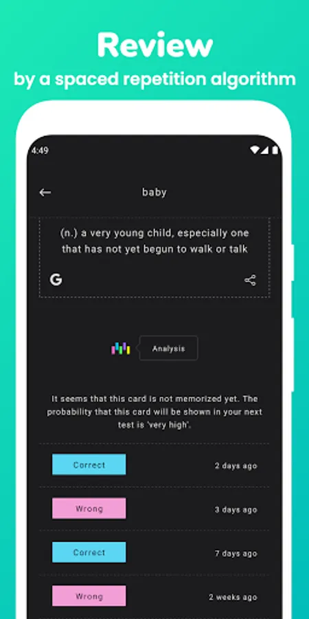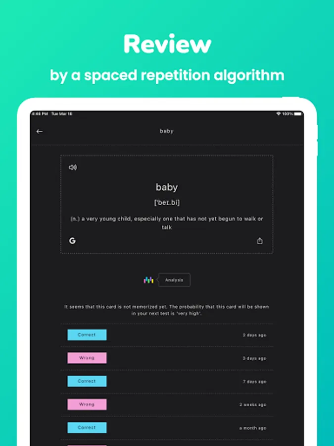 -By comparing your habit to other users, AI continuously personalizes the level of difficulty and the amount of your test for effective vocabulary memorization.