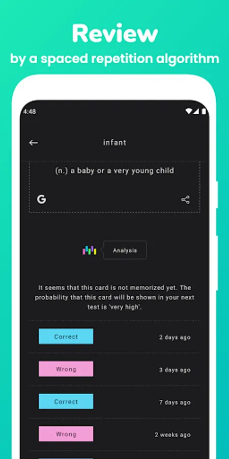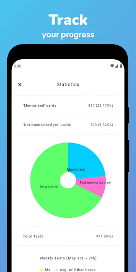 -By comparing your habit to other users, AI continuously personalizes the level of difficulty and the amount of your test for effective vocabulary memorization.