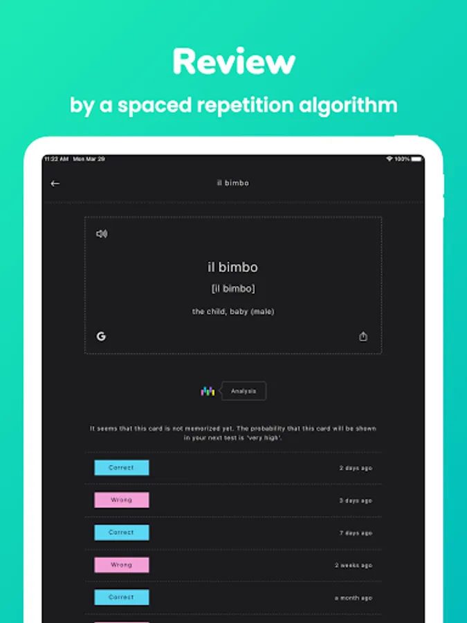 -Artificial Intelligence (AI) picks Italian words that you need to learn based on the detailed analysis of your achievement and progress.