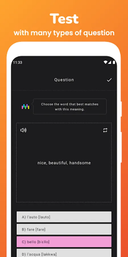 -Support many types of test for learning Italian (Multiple choice question, listening, matching, flipping flashcard and etc.)