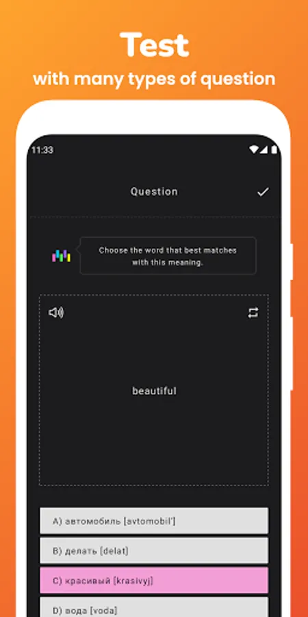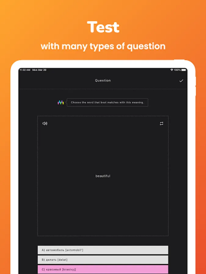 -Support many types of test for learning Russian (Multiple choice question, listening, matching, flipping flashcard and etc.)