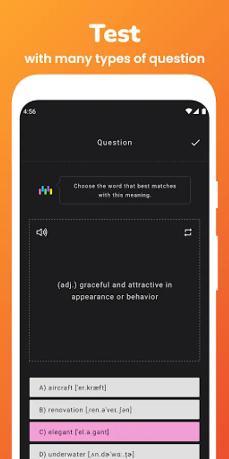 -By comparing your habit to other users, AI continuously personalizes the level of difficulty and the amount of your test for effective vocabulary memorization.
