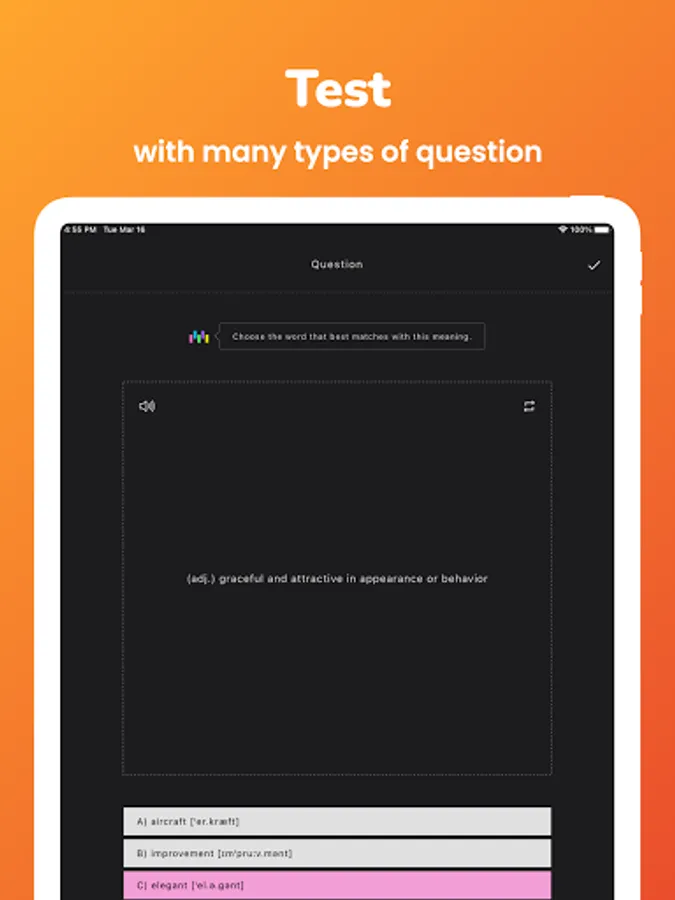 -Support many types of test for learning TOEIC vocabulary (Multiple choice question, listening, matching, flipping flashcard and etc.)