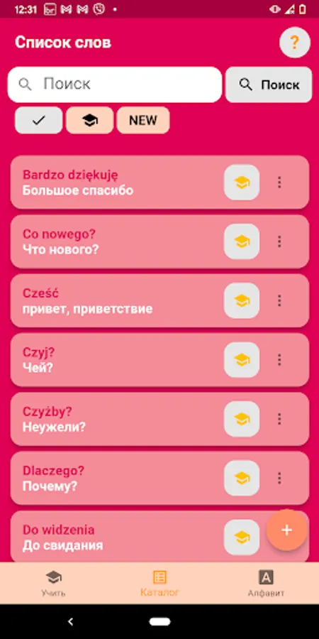 In addition to the existing list of the most used Polish words, the application has the ability to add your words to the Polish dictionary.