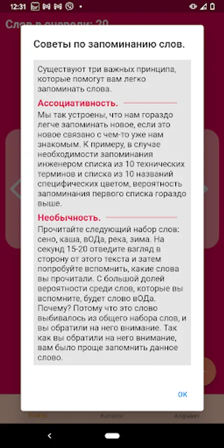 If you are looking for an Android application that will help you learn a language for beginners, then our program will help you. The application has a built-in repetition mechanism, which, according to a certain algorithm, from time to time shows you previously learned words so that you remember them exactly.