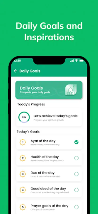 Nurture your spirituality by setting daily goals that encompass key elements of Islamic practice. Each day, embark on a journey of spiritual growth with handpicked ayat (verses from the Quran), inspiring hadith (sayings of Prophet Muhammad), powerful dua (supplications), suggestions for good deeds, and specific prayers to focus on.