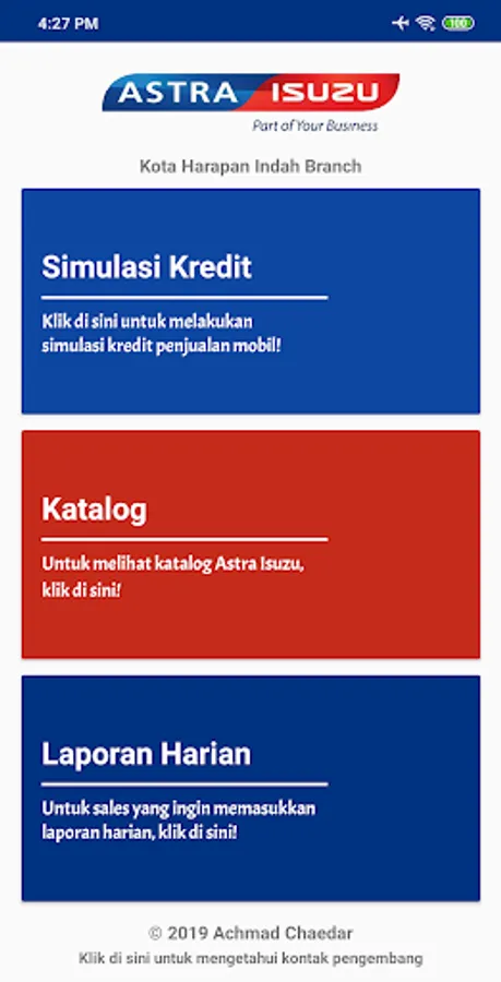 This application is an application that can support sales performance at Astra Isuzu branch of Harapan Indah City branch. The application includes three features, namely Credit Simulation, Product Catalog, as well as Daily Sales Reports.