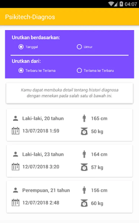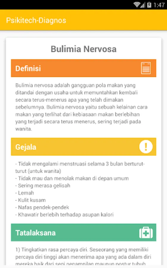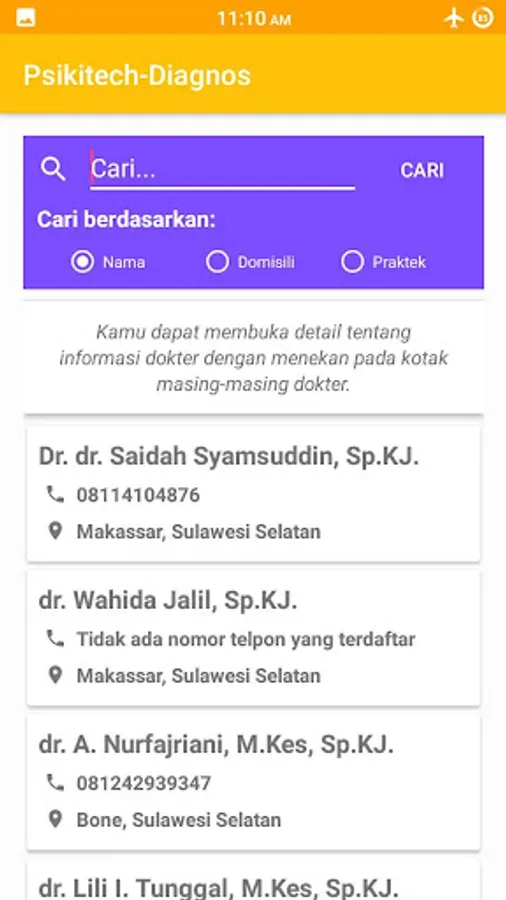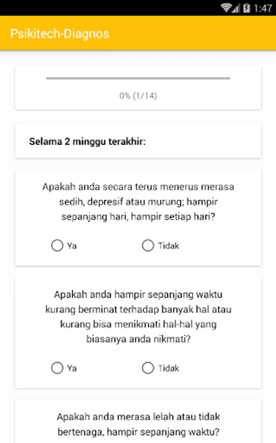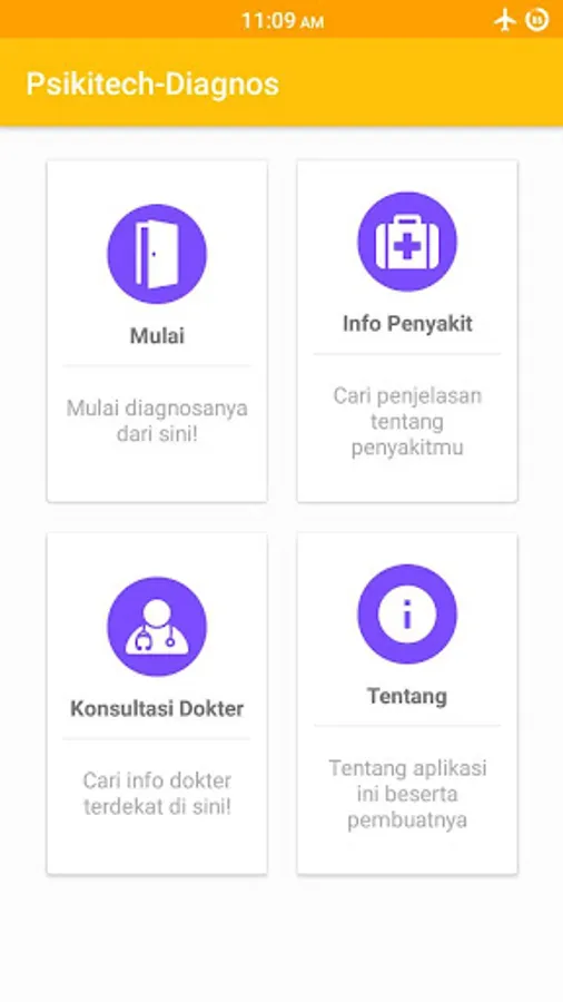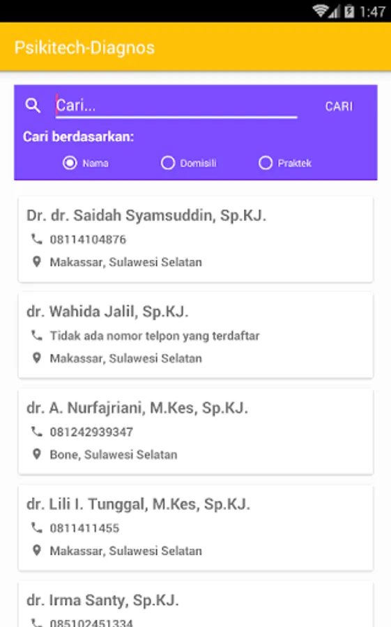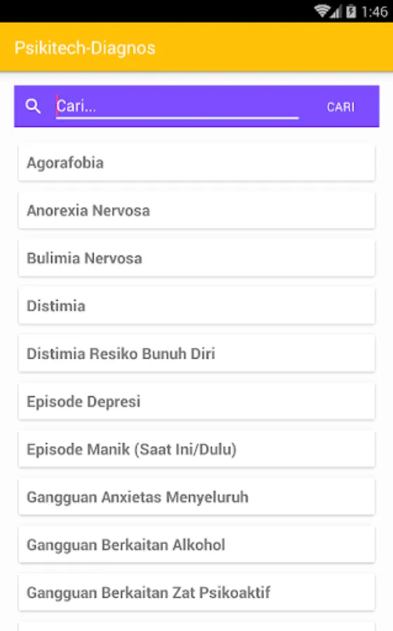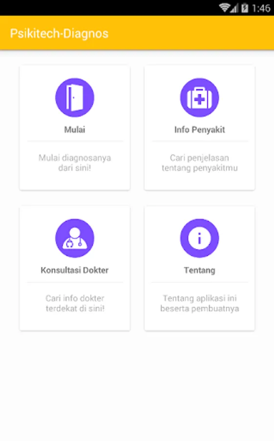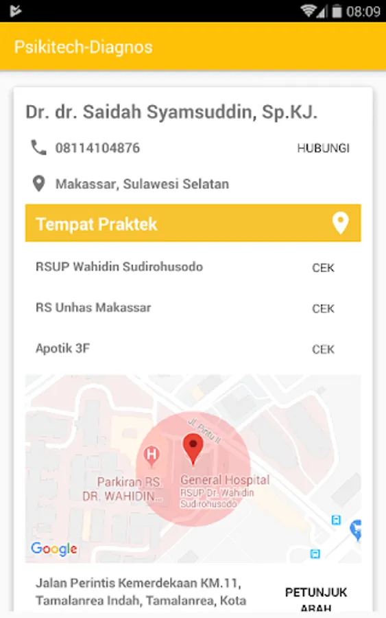 Psikitech-Diagnos is an android app that is very useful for all people in all ages, it helps you in determine your current psychological condition. You don't have to be crazy first and then need to use it.. You could determine about your psychiatric condition earlier and learn the classification of psychiatric disorders because we provide features description of psychiatric illness. We also provide a doctor consultation feature (include full address of physician practice connected with google Maps) so you can consult the best psychiatrists around Indonesia! However, for the moment the database of psychiatrists only available in Sulawesi area. Further we will add more psychiatrists into our database.