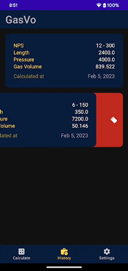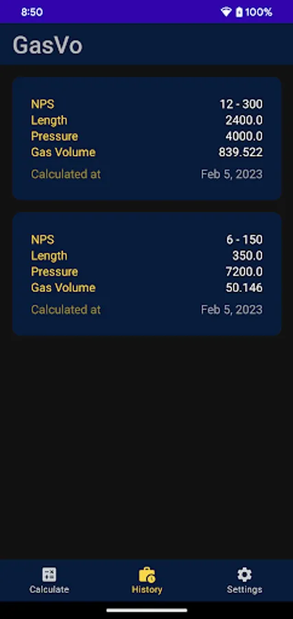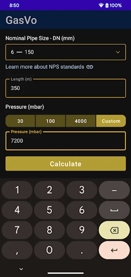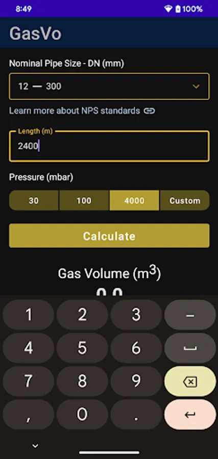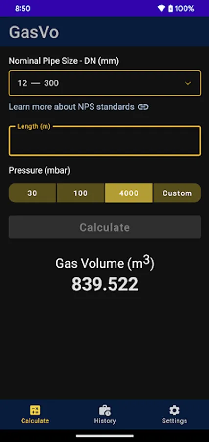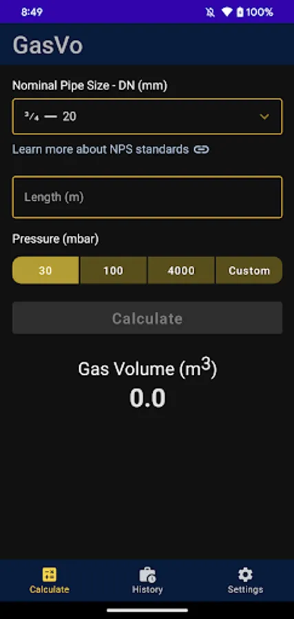 A Gas Pipe Volume Calculator app that uses the NPS (Nominal Pipe Size) standard. Calculations are conveniently saved to the device locally and can be found on the History tab.