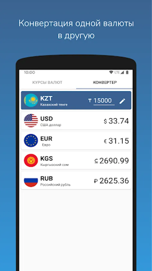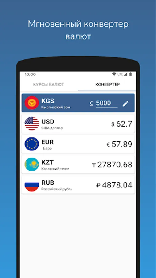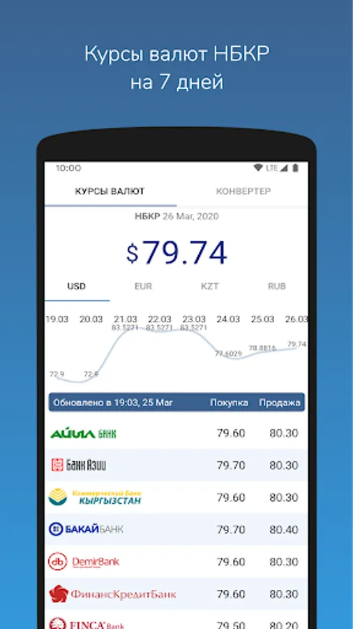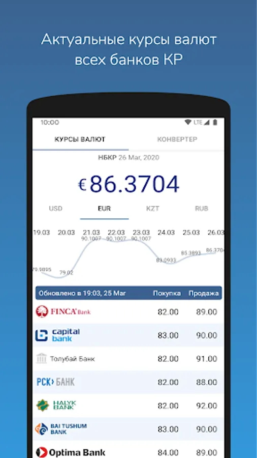 The annex contains information on the main currencies in Kyrgyzstan, including the dollar, euro, ruble, tenge. The program constantly updates the rate of the National Bank of the Kyrgyz Republic, of all banks and carries out the recount, based on new data.