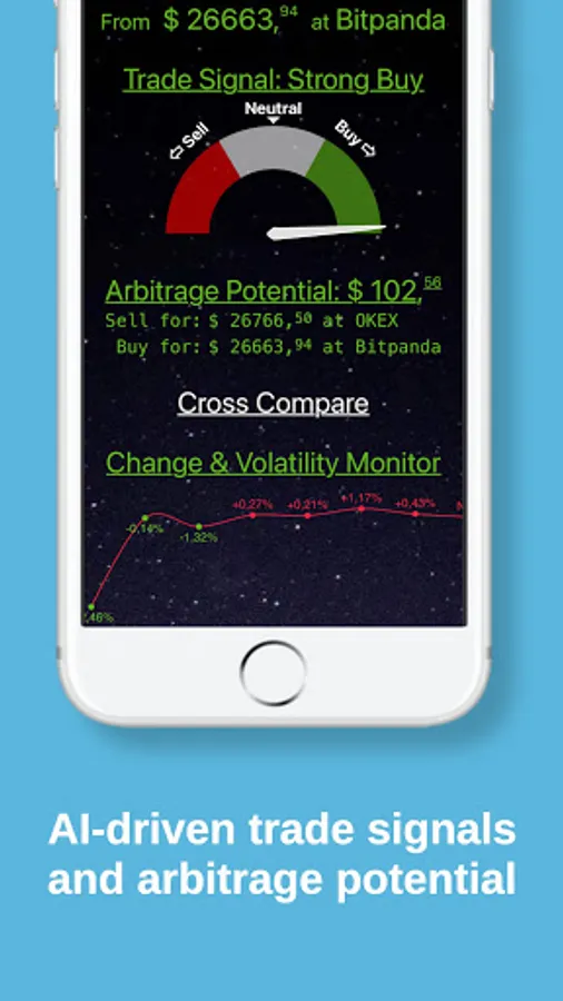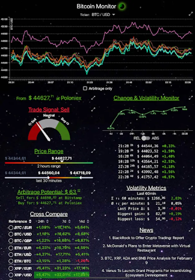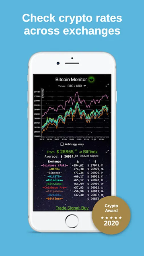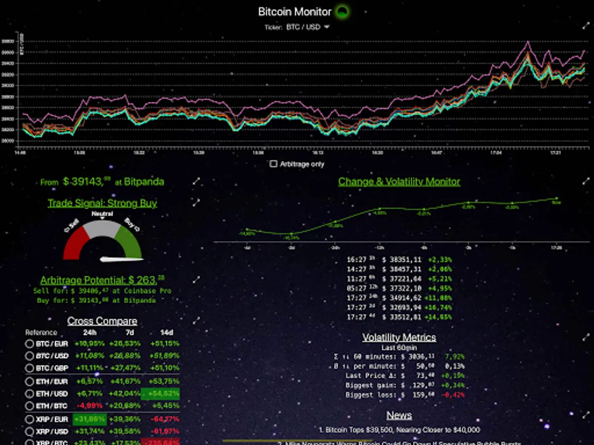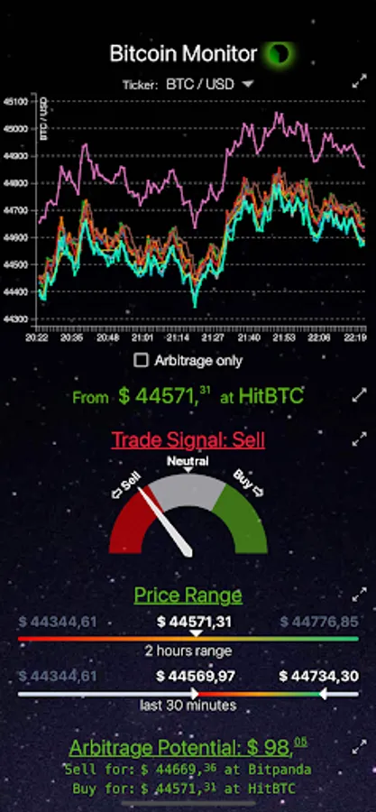 Bitcoin Monitor visualizes crypto prices across exchanges, allowing you to spot the cheapest price for the cryptocurrency you're looking for. If you're into trading, then use our purely AI driven trade signals which provide you with up-to-date trade recommendations. You can use these recommendations to support your buy, sell or HODL decisions.